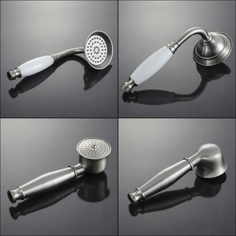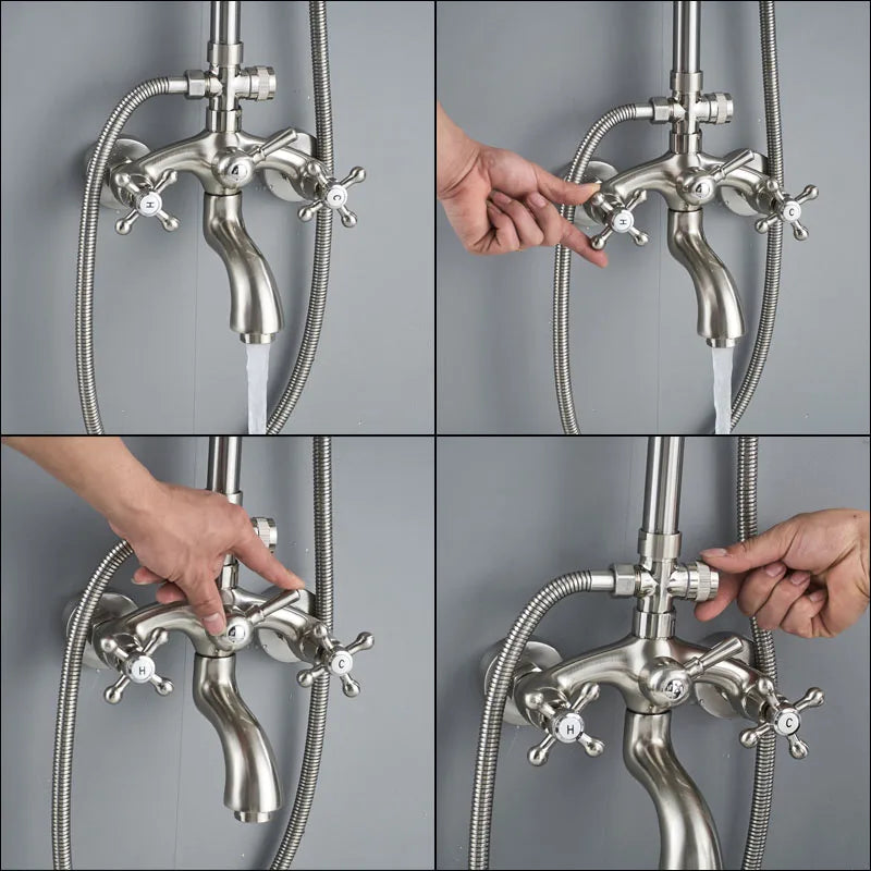 Mejora tu baño con el grifo mezclador de ducha tipo lluvia de doble manija Decorbites en níquel cepillado con ducha de mano y eleva tu espacio a nuevos niveles de estilo y comodidad.