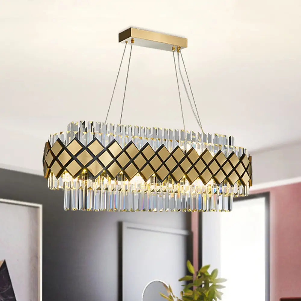 Lámpara colgante contemporánea dorada DecorBites™ - Lámpara ovalada de isla con bloques de cristal, 16 luces y marco de celosía para comedor