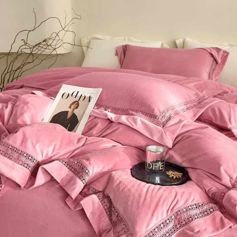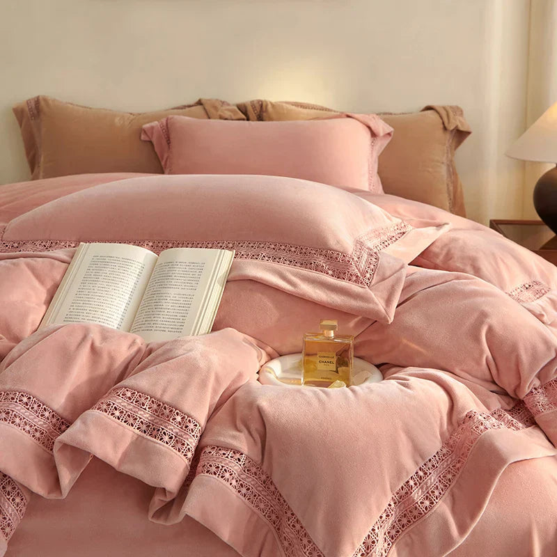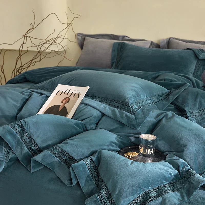 Juego de cama DecorBites™ Cozy Velvet Lace: Funda nórdica, sábana, fundas de almohada - 4 piezas. Cálido y elegante.
