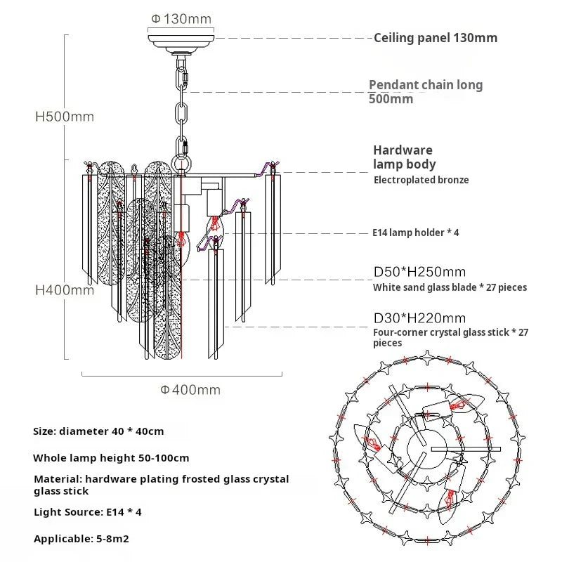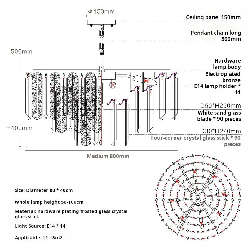 Disponible en varios tamaños (40 cm de diámetro x 40 cm de altura, 60 cm de diámetro x 40 cm de altura, 80 cm de diámetro x 50 cm de altura), con opciones de personalización, esta lámpara colgante se adapta a diferentes dimensiones y preferencias de cada habitación. La pantalla de cristal añade un toque de glamour y lujo, reflejando la luz de forma espectacular para crear un efecto fascinante.