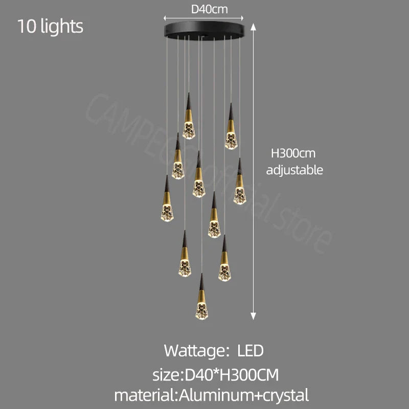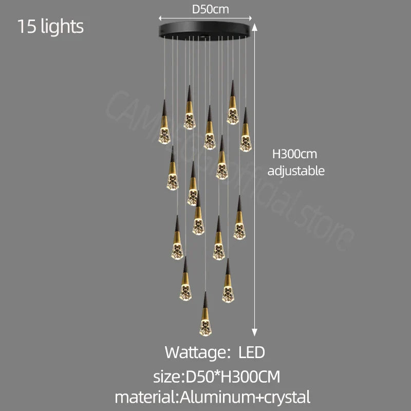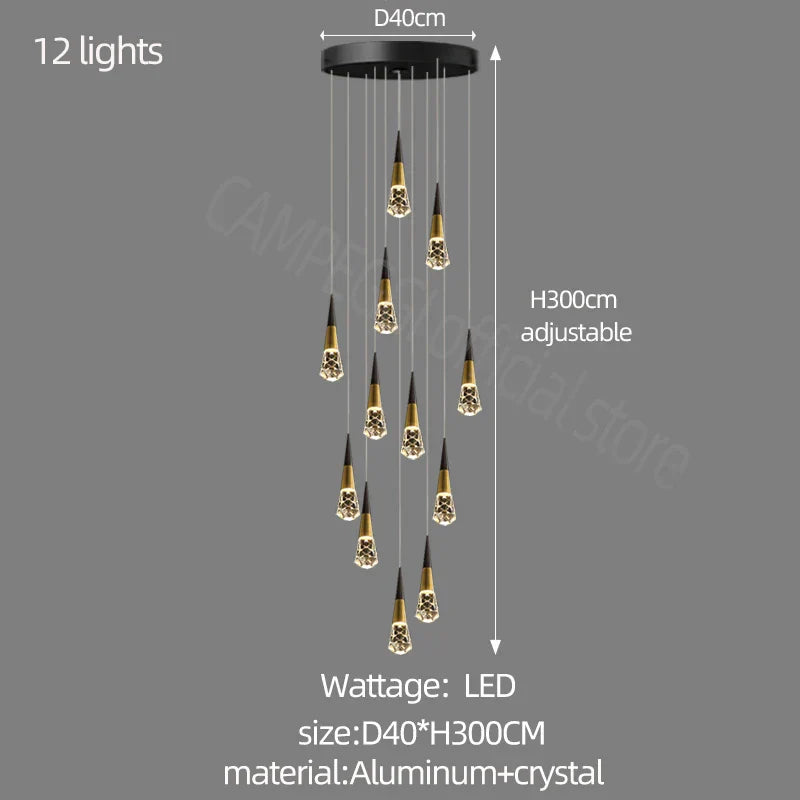 Presentamos la lámpara de araña de cristal LED para escaleras Decorbites, un complemento deslumbrante para cualquier sala de estar, cocina o restaurante elegante. Esta exquisita lámpara colgante irradia estilo moderno y sofisticación, iluminando a la perfección espacios como salones, estudios, dormitorios principales, otros dormitorios, vestíbulos y habitaciones de hotel.