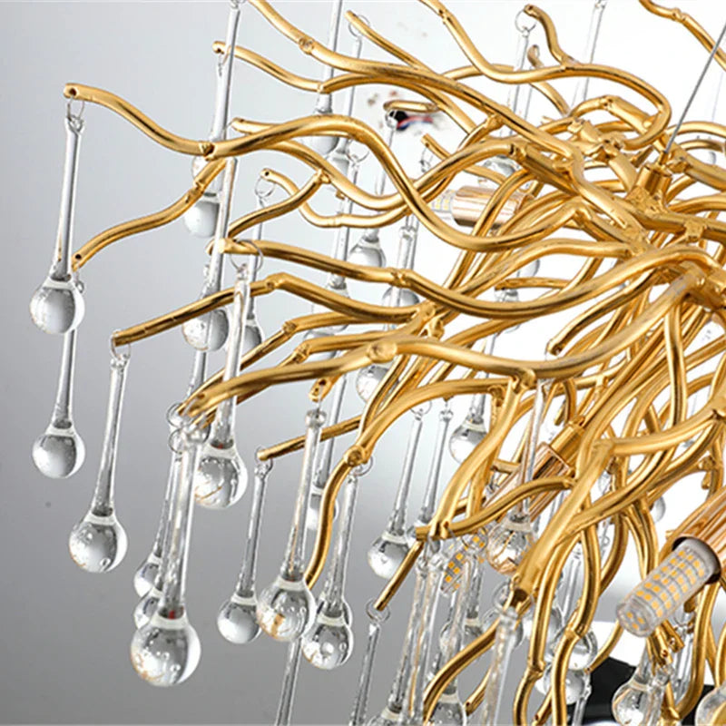 Certificada para cumplir con los más altos estándares de calidad y seguridad, esta lámpara de araña está diseñada para realzar su decoración. Con su cuerpo de cristal y su impresionante diseño de gotas de agua, crea un fascinante juego de luces y sombras, proyectando un brillo cálido y acogedor en cualquier habitación.