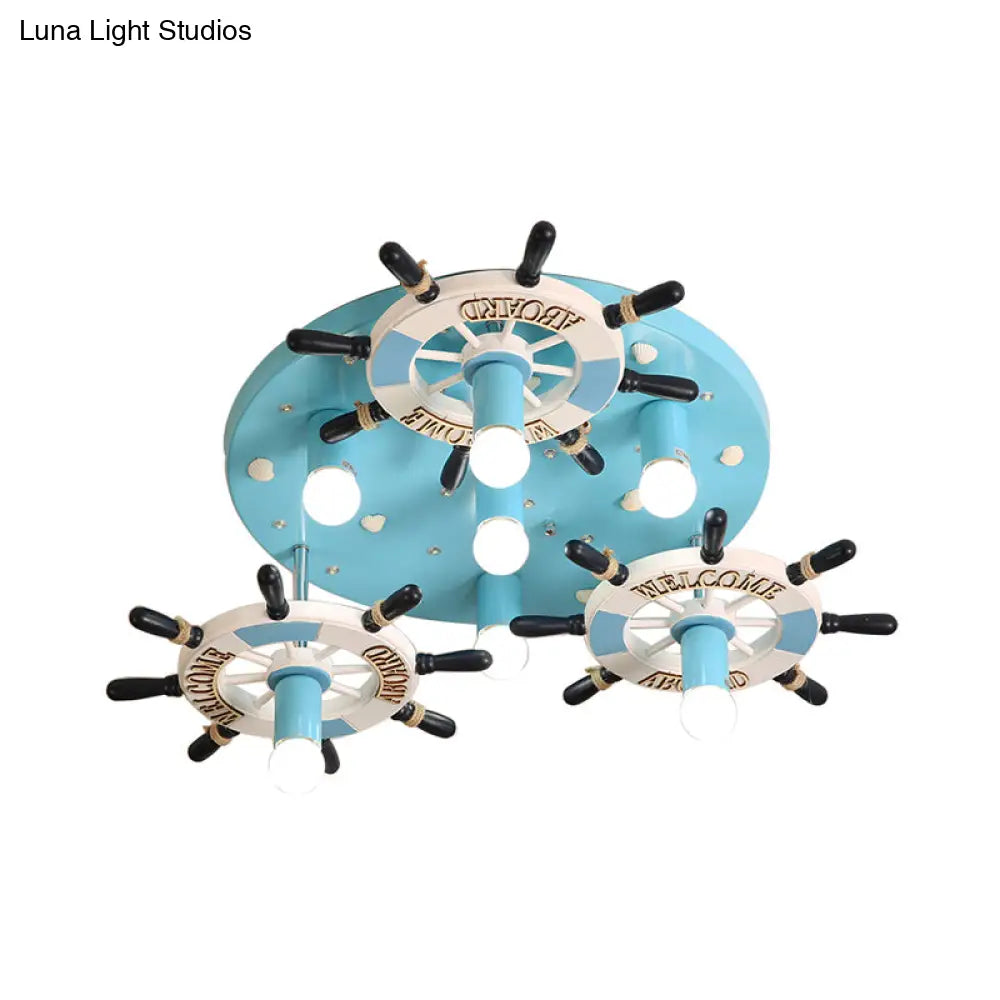 DecorBites™ DecorBites™ Lámpara de techo semiempotrada con forma de timón de madera azul - Estilo mediterráneo, 7 bombillas