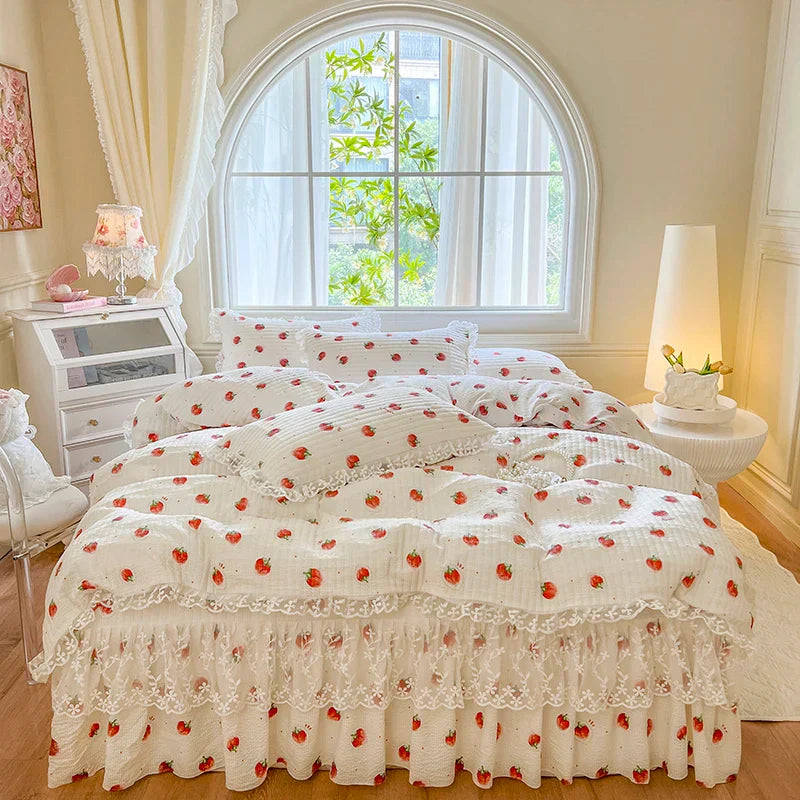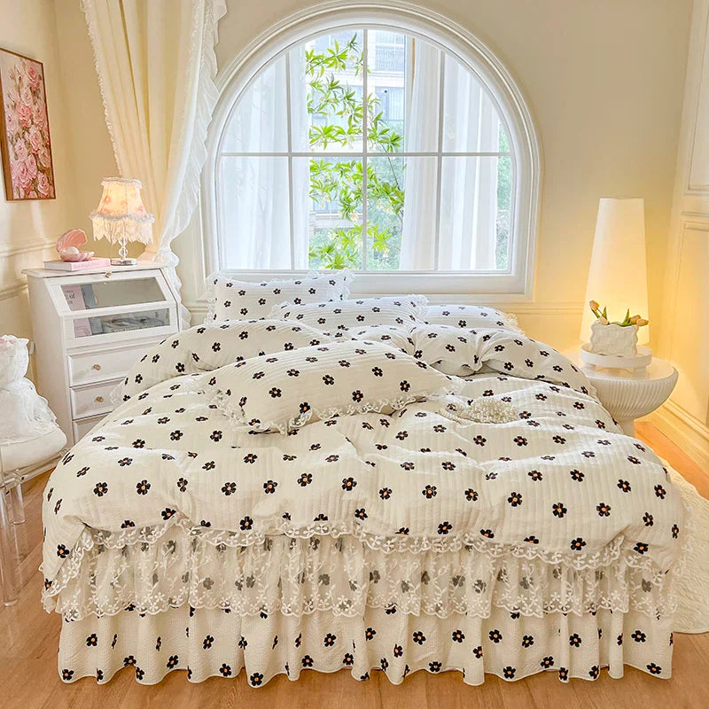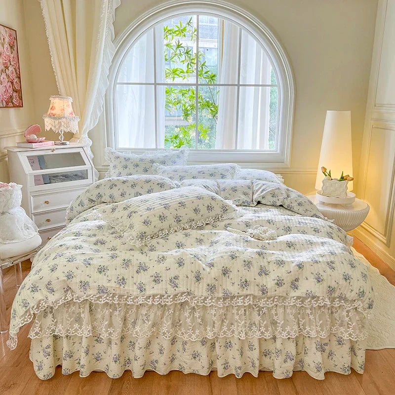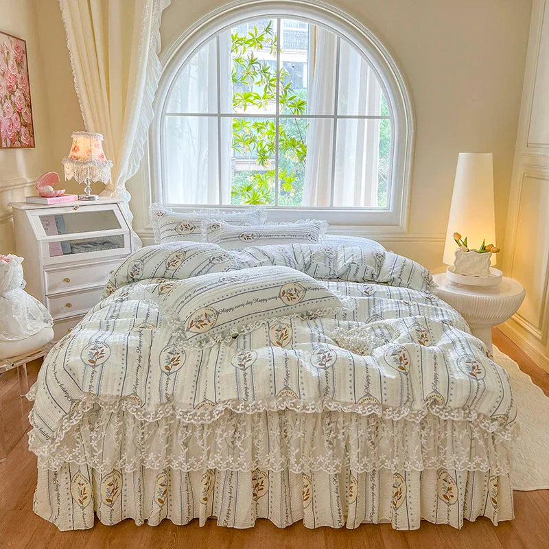 Juego de cama DecorBites™ con volantes de encaje francés y tela seersucker: 4 piezas, funda nórdica estilo princesa