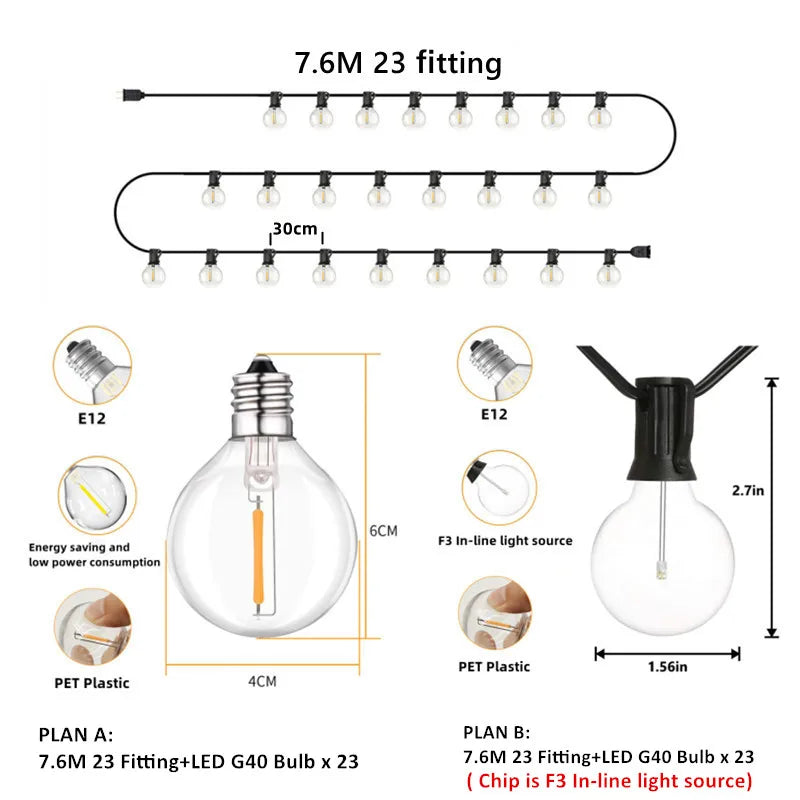 Realza tu espacio exterior con las guirnaldas de luces LED Decorbites G40, diseñadas para crear un ambiente festivo y una iluminación encantadora para el jardín. Creadas para complementar tu decoración exterior, estas guirnaldas aportan un toque de elegancia y encanto a cualquier ambiente.