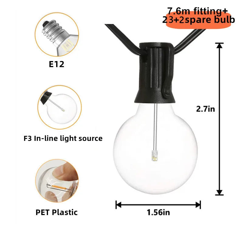 Experimenta la magia de las guirnaldas de luces LED Decorbites G40 y transforma tu espacio exterior en un oasis cautivador. Deja que su suave luz cree un ambiente tranquilo para tus reuniones y celebraciones. Ilumina tus noches y haz que cada momento sea inolvidable con estas exquisitas guirnaldas de luces.