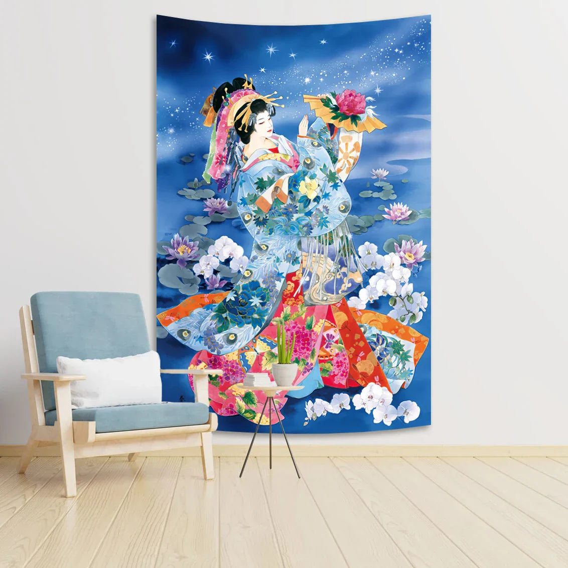 Tapiz DecorBites™ Geisha en Kimono - Decoración para el hogar con fondo de sakura
