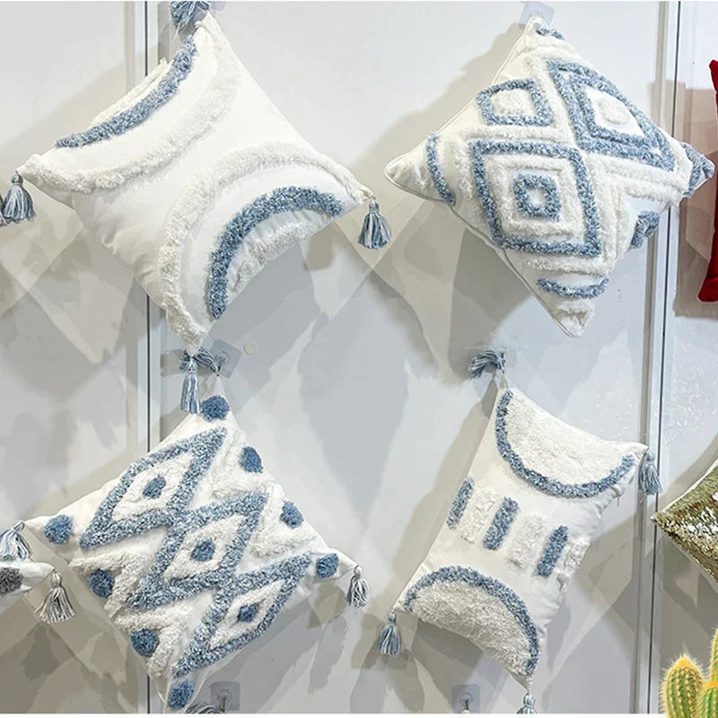 Fundas de almohada DecorBites™ con bordado geométrico de rombos - Azul y blanco con flecos, 45x45/30x50 cm