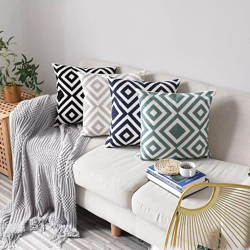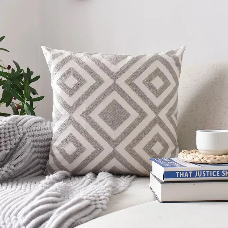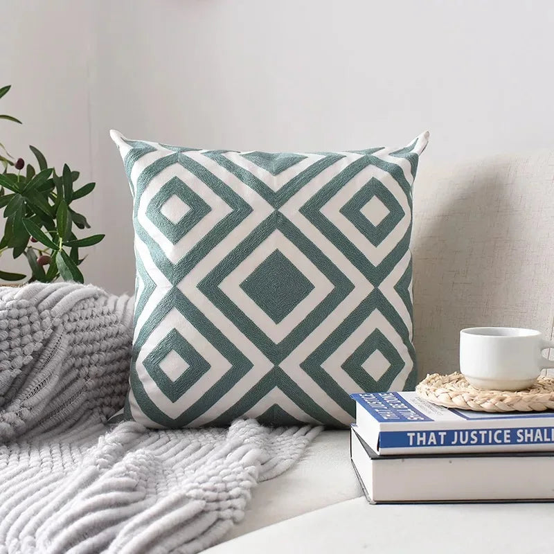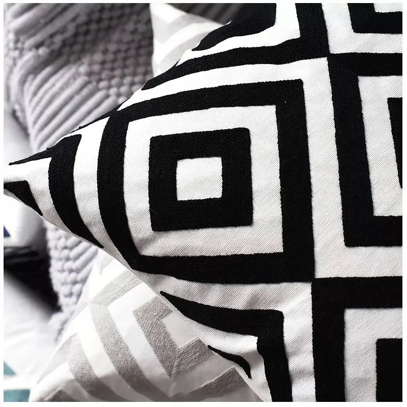 El intrincado patrón geométrico bordado añade un toque de sofisticación a cualquier espacio, ya sea el salón, el dormitorio o incluso un acogedor rincón de café. Su cremallera facilita el cambio de los rellenos de los cojines o la limpieza de la funda cuando sea necesario.