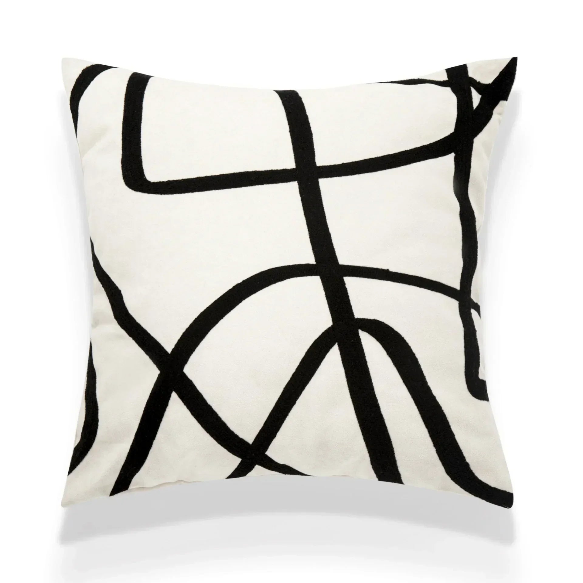 Funda de almohada bordada con líneas geométricas DecorBites™ en lona de ante negra, blanca y beige.