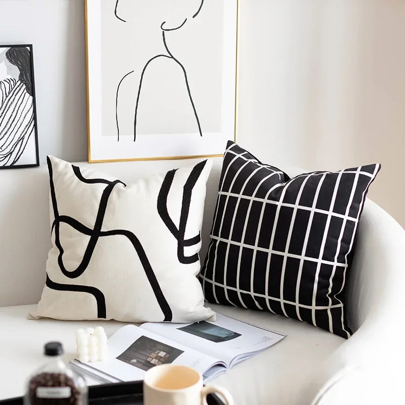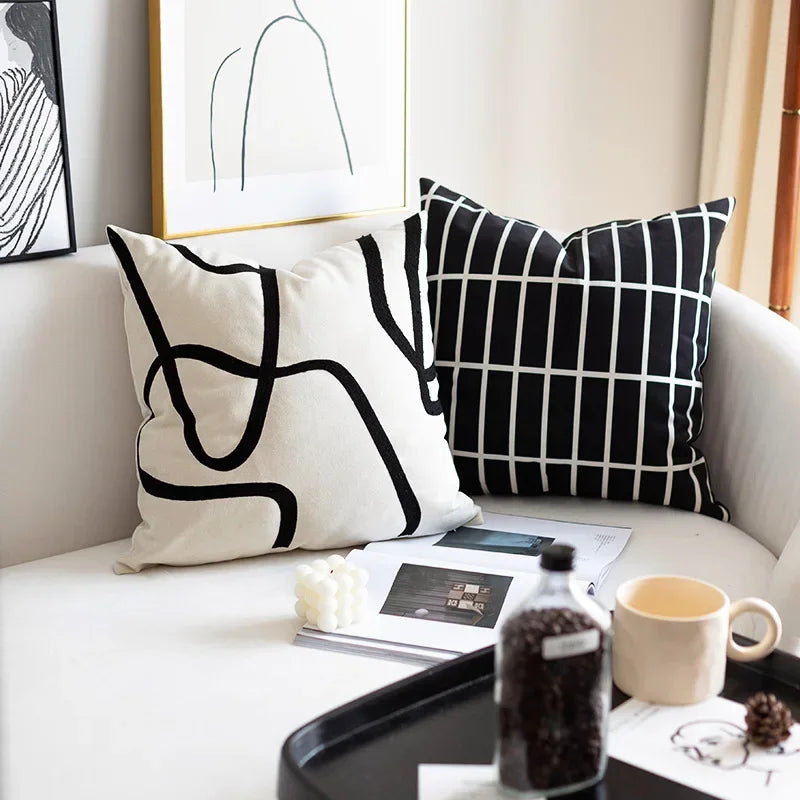 Realza tu decoración con la funda de almohada de ante bordada con línea geométrica de Decorbites, una pieza atemporal que combina estilo, comodidad y artesanía de calidad para una experiencia verdaderamente lujosa.