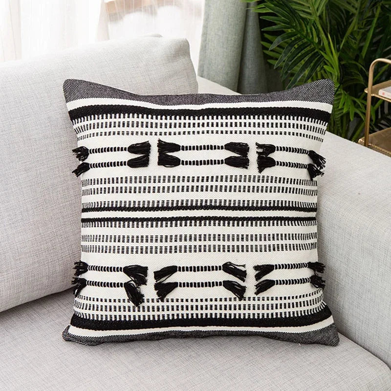 Funda de cojín DecorBites™ con borlas geométricas - Cojín decorativo tejido amarillo y negro