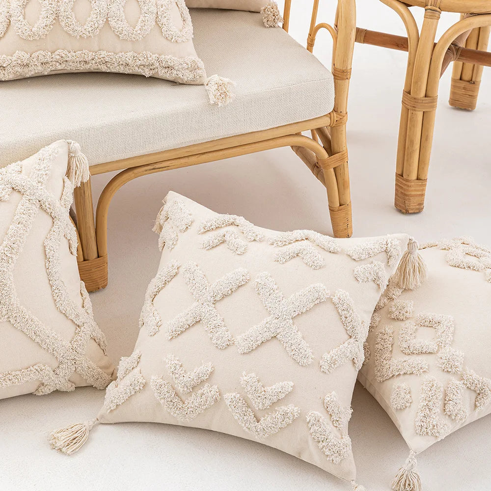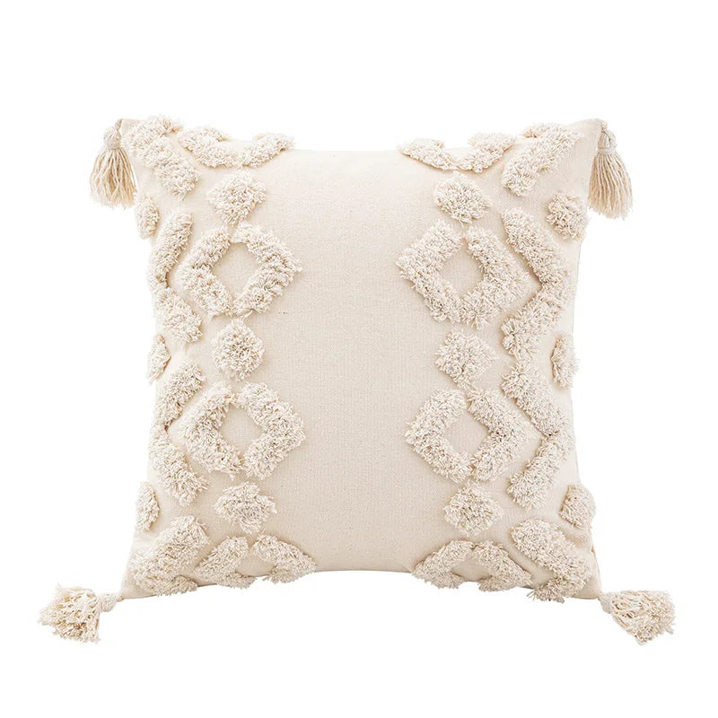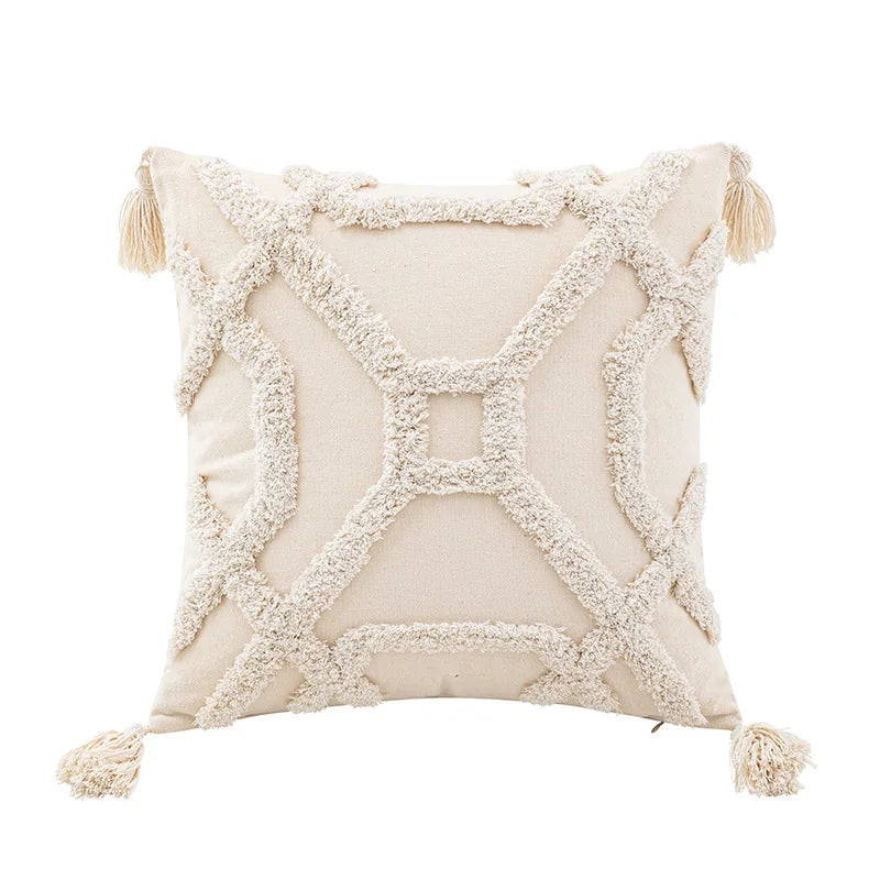 Funda de cojín DecorBites™ con diseño geométrico capitoné, color beige, estilo patchwork, estilo wabi-sabi.