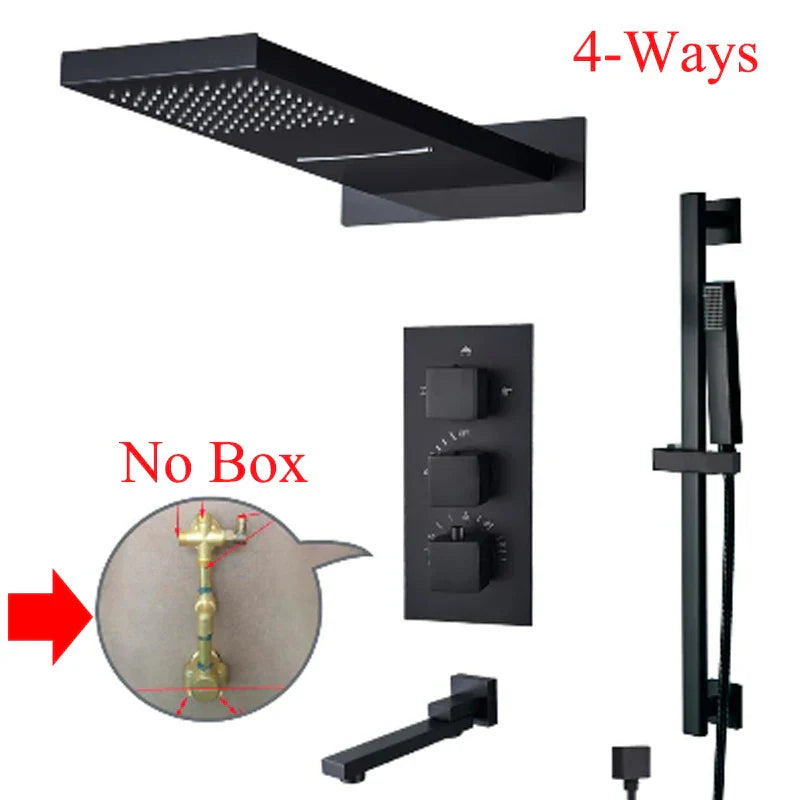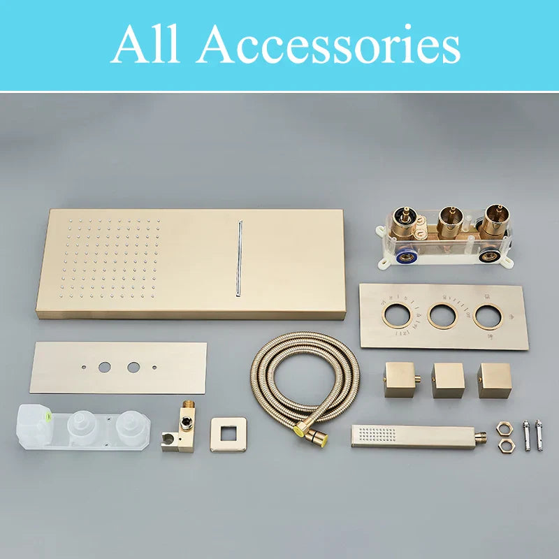 Deléitese con el lujoso juego de grifería para ducha tipo cascada termostática Decorbites Gold - Sistema de ducha de pared, diseñado para aquellos que aprecian las cosas buenas de la vida.