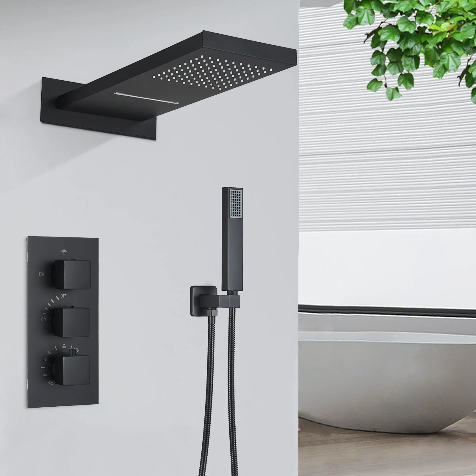 Sumérgete en el lujo de este sistema de ducha de alta gama, con grifería termostática para una combinación perfecta de agua caliente y fría. Con tres manijas para un control óptimo, este conjunto de ducha irradia sofisticación y elegancia.