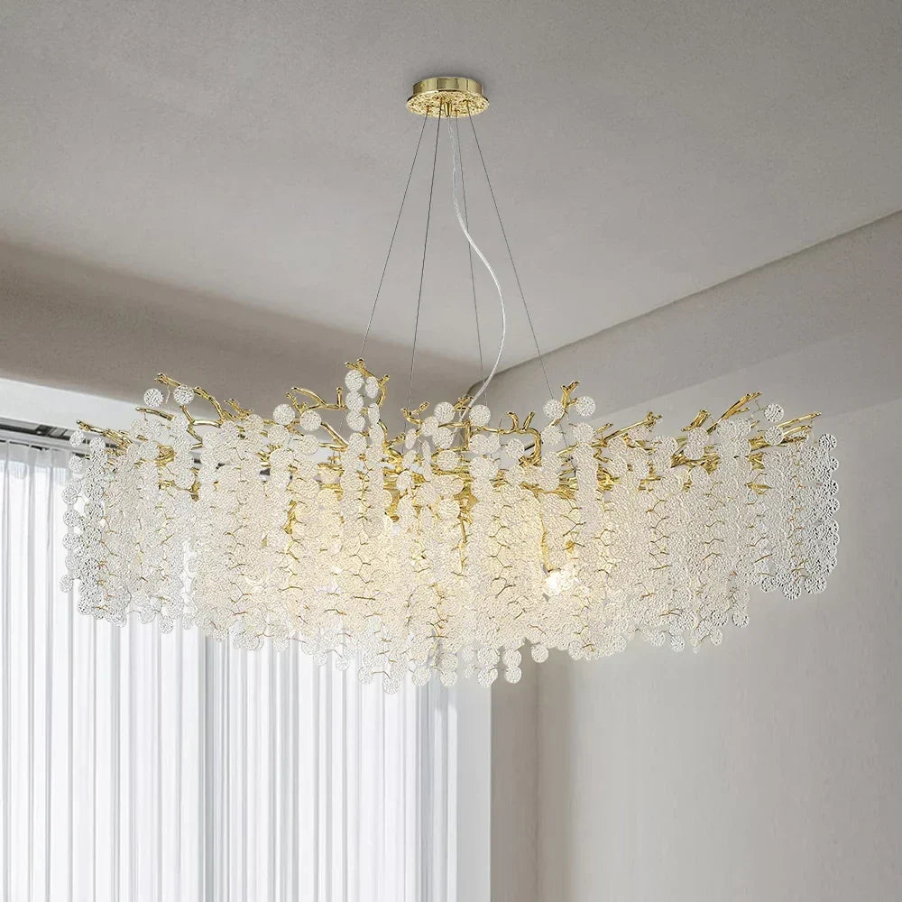 Elaborada con esmero, esta lámpara de araña presenta un diseño fascinante con adornos de cristal que evocan un árbol dorado de la abundancia que cae en cascada desde el techo. El cálido tono dorado de la pantalla añade un toque de glamour y opulencia a su hogar, convirtiéndola en el centro de atención de cualquier habitación.