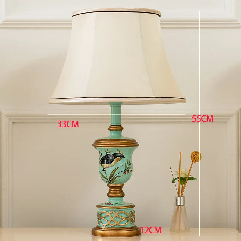 Elaborada con resina ABS de alta calidad, esta lámpara de mesa presenta un diseño clásico vintage con cuerpo verde y pantalla de tela de estilo atemporal. La estructura chapada en oro le aporta un toque de elegancia.