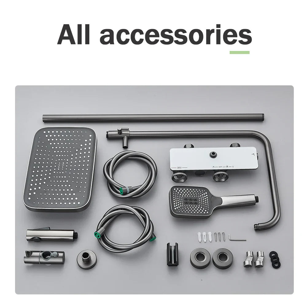 Transforma tu rutina de ducha con el juego de grifería termostática digital Decorbites gris con sistema de lluvia. Disfruta de lujo, estilo y comodidad en un solo sistema de ducha.