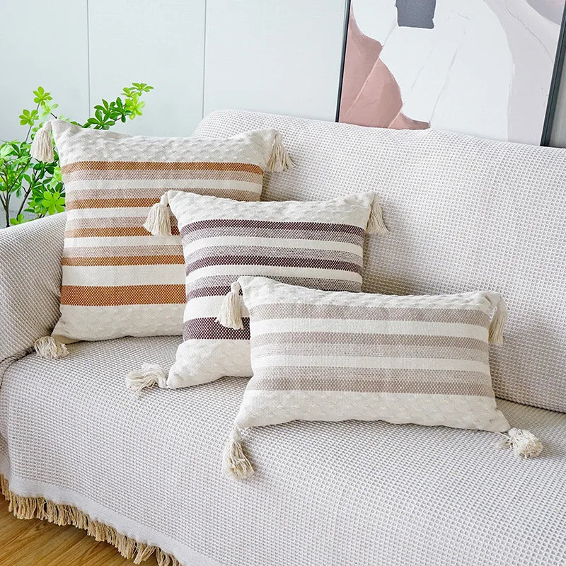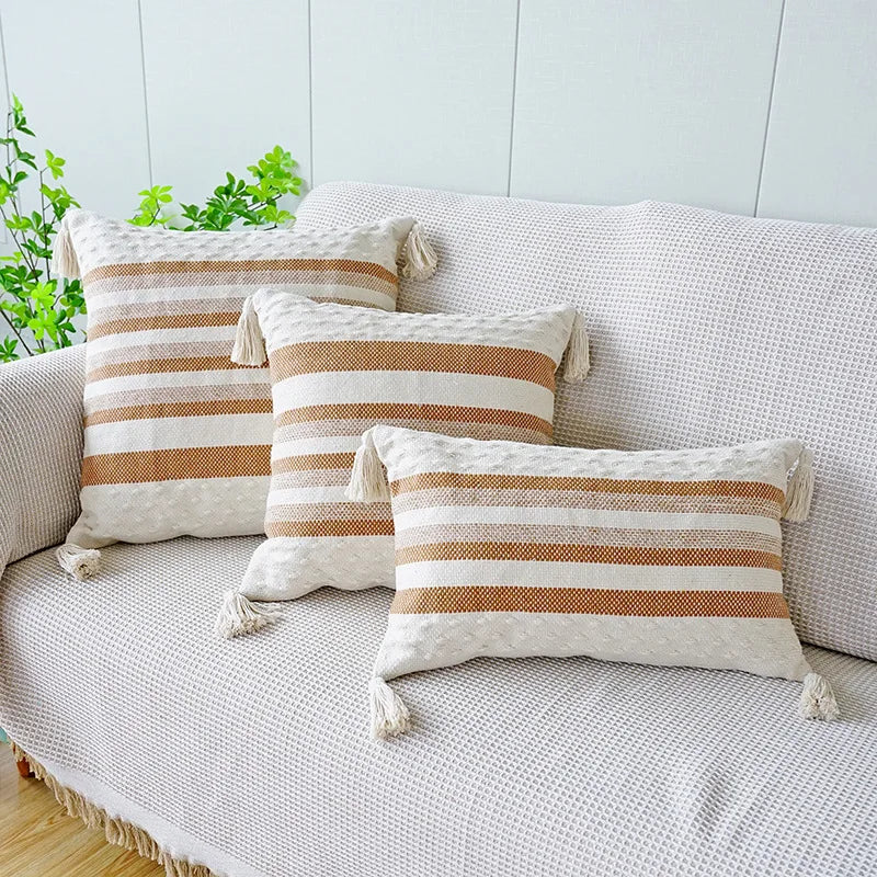 Funda de almohada DecorBites™ color marfil, marrón, café y rayas negras con borlas, disponible en tamaños de 45x45 cm, 30x50 cm y 50x50 cm.