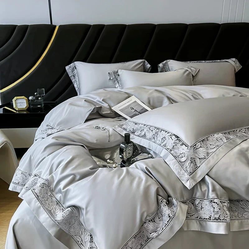El juego incluye una funda nórdica, dos fundas de almohada y una sábana bajera, todas con un elegante diseño bordado en el ancho borde de encaje. El color gris neutro aporta un toque de sofisticación a cualquier dormitorio, convirtiéndolo en una opción atemporal para una impresión duradera.