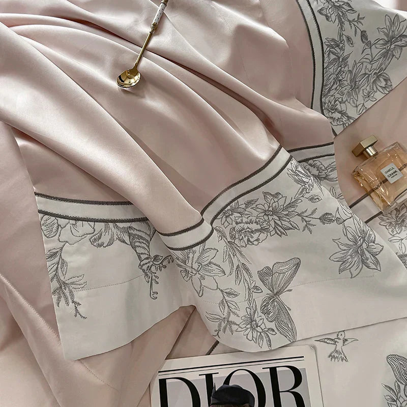 Realza la decoración de tu dormitorio con el juego de cama bordado con mariposas y flores de lujo y disfruta de una comodidad sin precedentes. Añade un toque de sofisticación y estilo a tu espacio con este exquisito juego de cama que sin duda te impresionará.