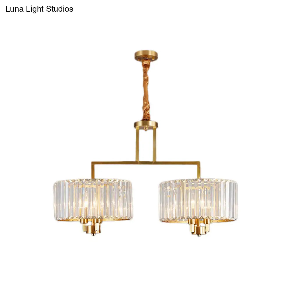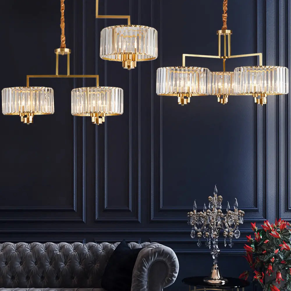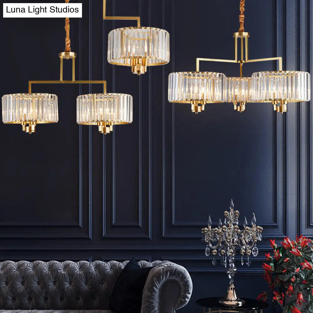 Lámpara de techo contemporánea dorada con forma de tambor y cristales transparentes - Lámpara colgante de 3/6/9 cabezas para sala de estar