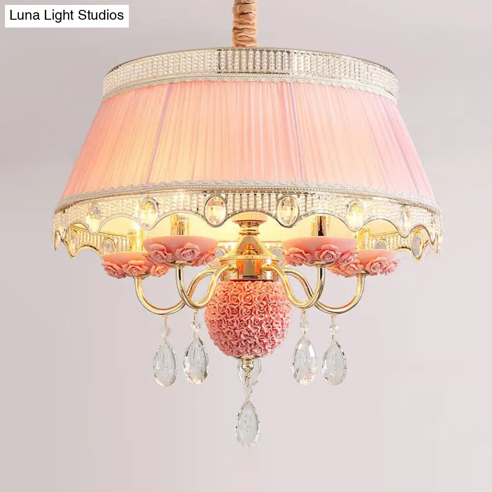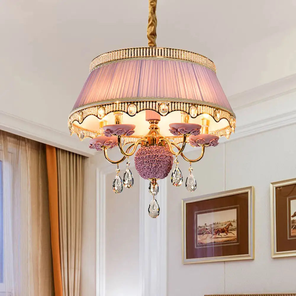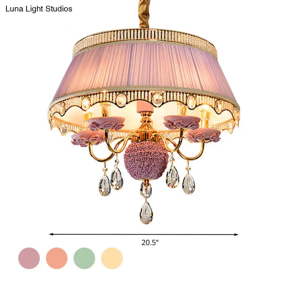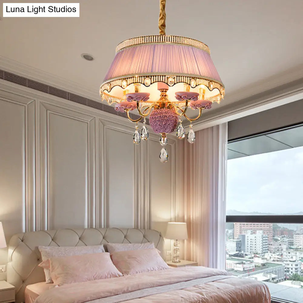 Esta lámpara de techo colgante de cinco luces, con diseño festoneado y tapizada en tela de primera calidad, disponible en rosa, azul y morado, y adornada con un cristal colgante, es un verdadero lujo para su hogar. Su diseño moderno y la fantástica calidad de sus materiales sin duda le impresionarán. Instalarla en su hogar es una excelente manera de crear un ambiente sofisticado y elegante en su espacio.