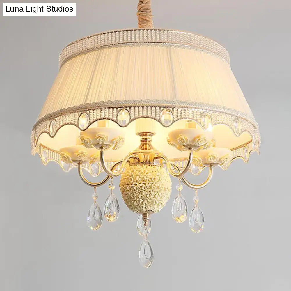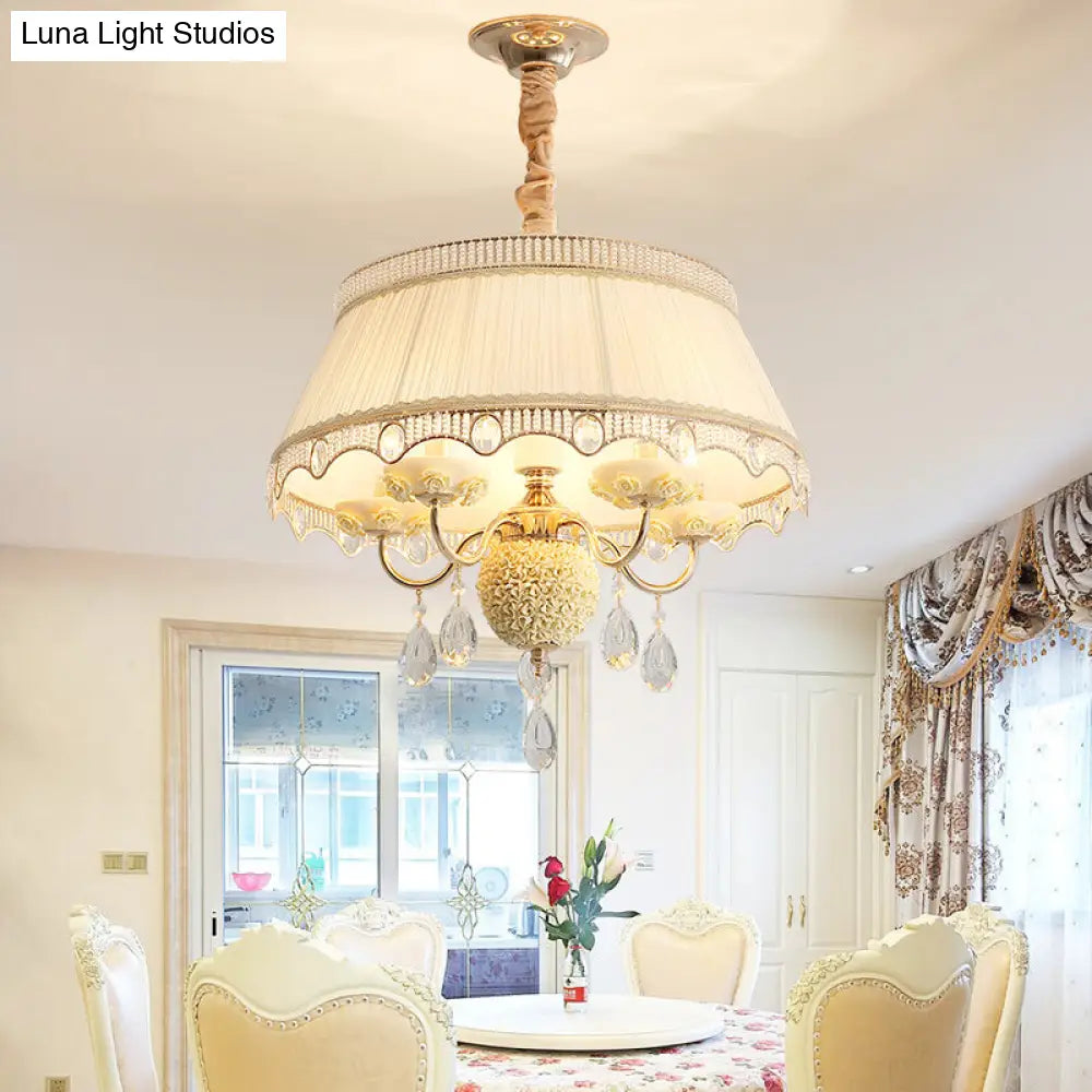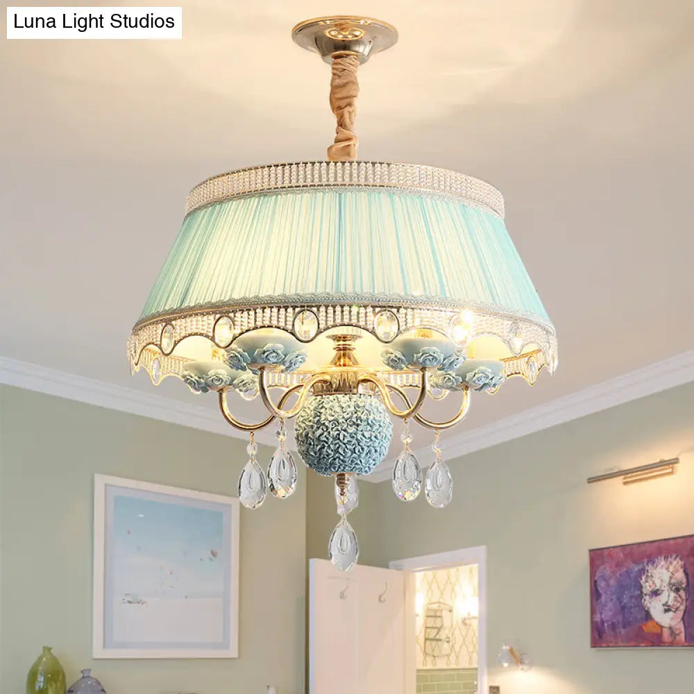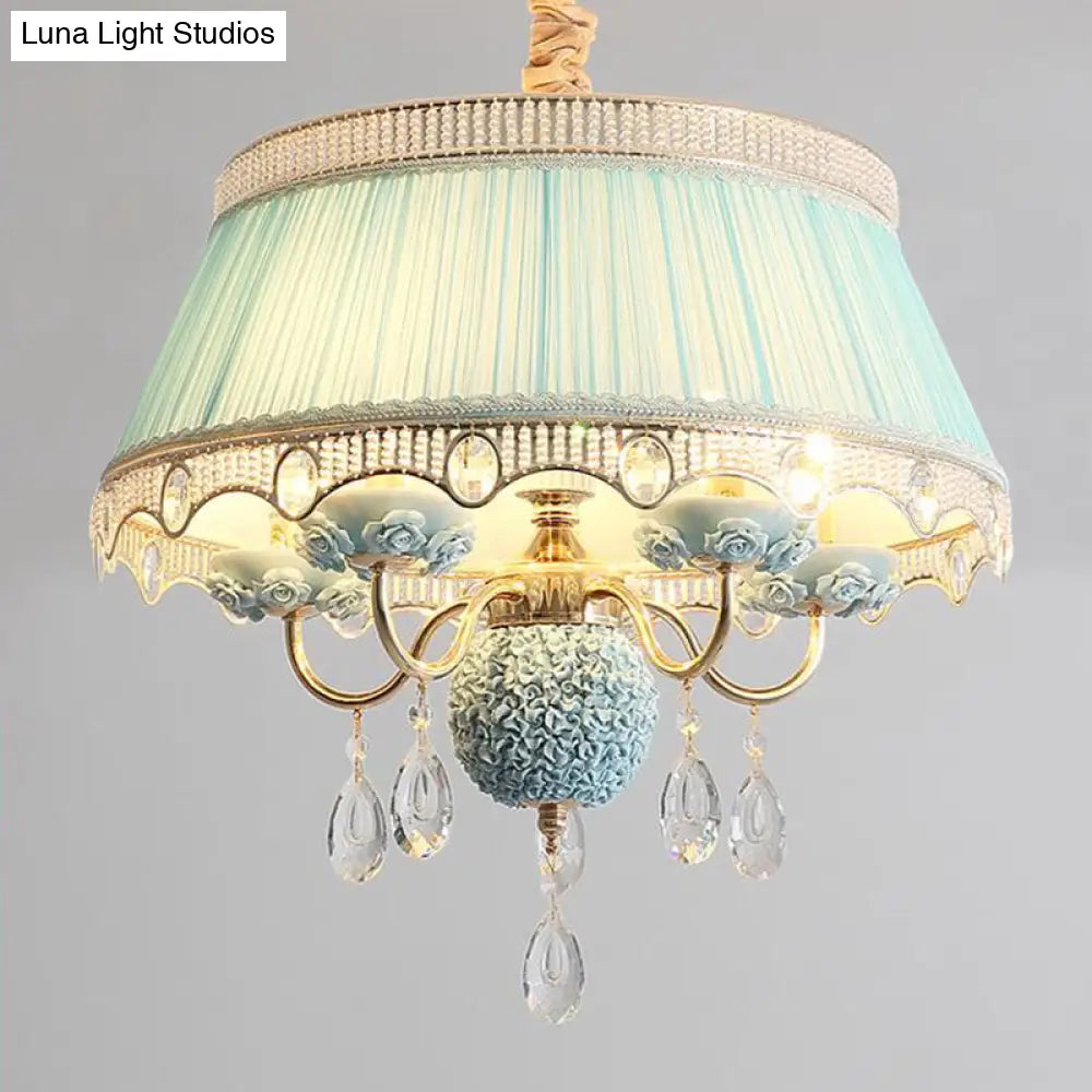 Esta lámpara de techo colgante de cinco luces, con diseño festoneado y tapizada en tela de primera calidad, disponible en rosa, azul y morado, y adornada con un cristal colgante, es un verdadero lujo para su hogar. Su diseño moderno y la fantástica calidad de sus materiales sin duda le impresionarán. Instalarla en su hogar es una excelente manera de crear un ambiente sofisticado y elegante en su espacio.