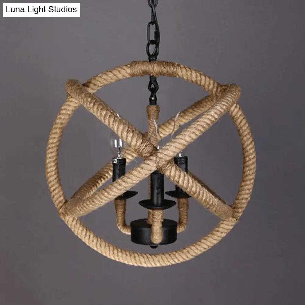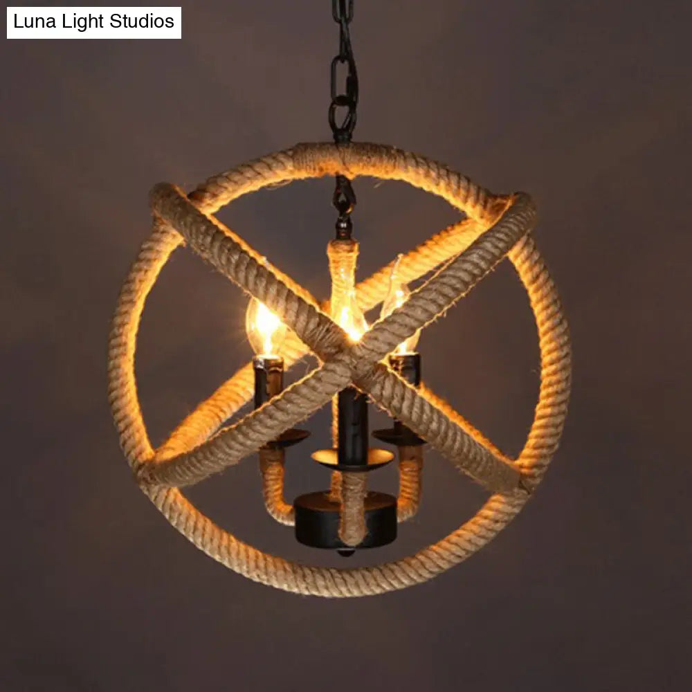 Lámpara de araña esférica de 3 cabezas con cuerda de cáñamo y luz colgante beige