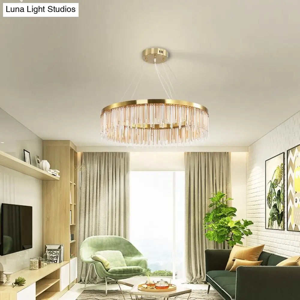 Lámpara de araña LED redonda moderna con prisma de cristal y acabado dorado