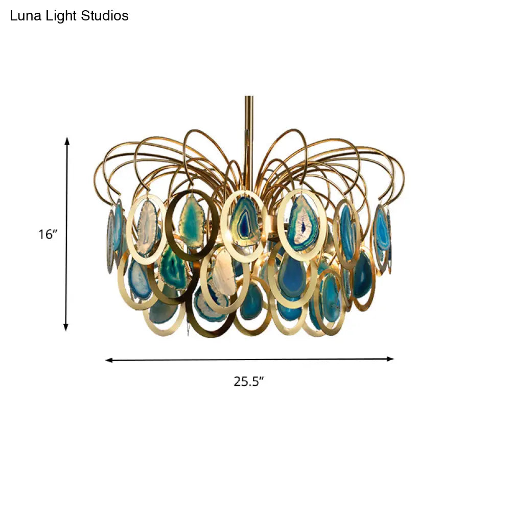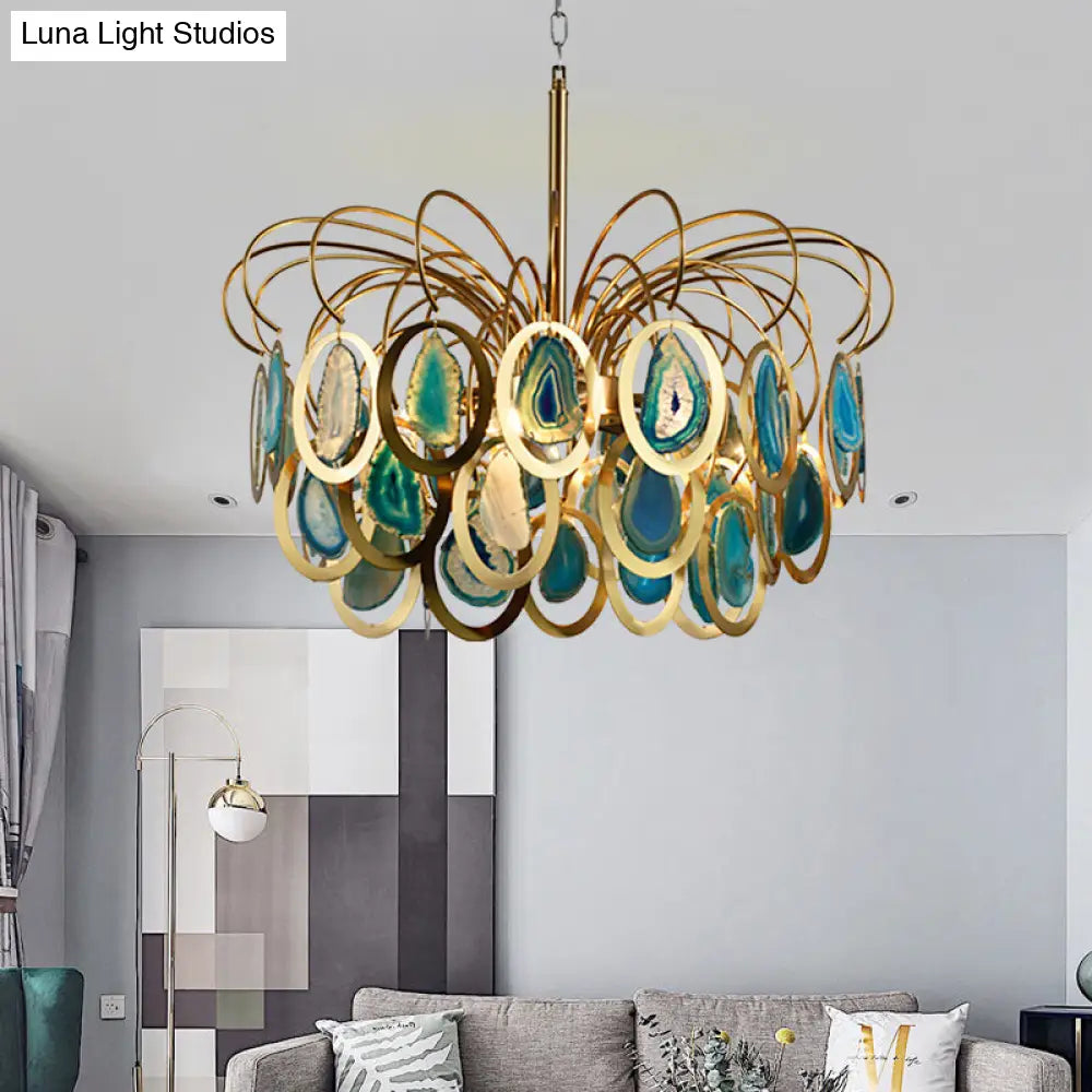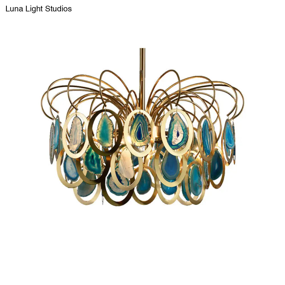 Lámpara de araña moderna con plumas de pavo real verdes - Colgante de techo de hierro de 5 cabezas con detalles de ágata