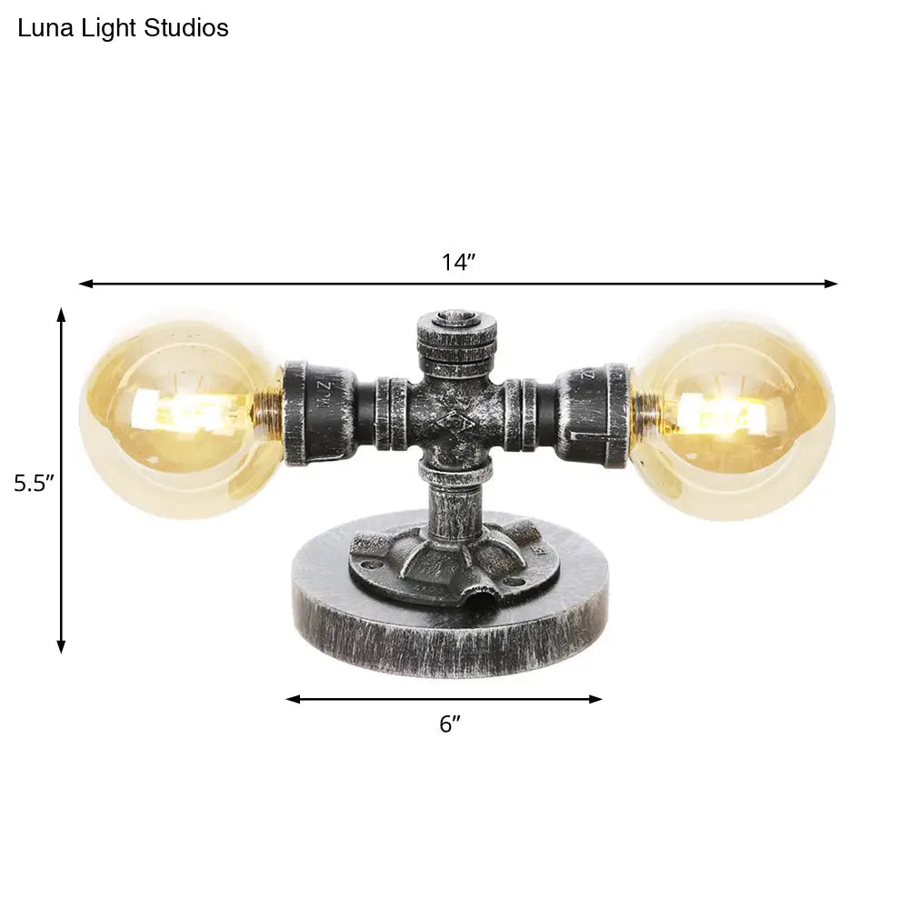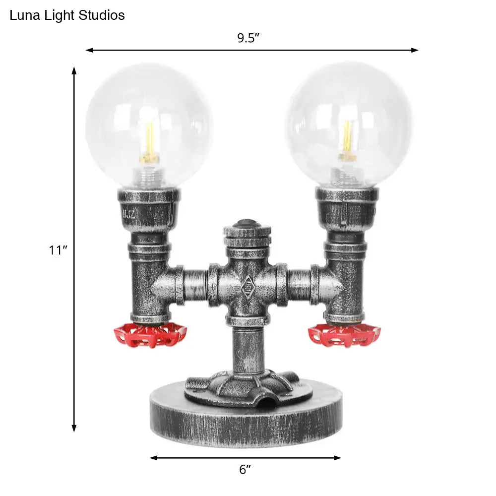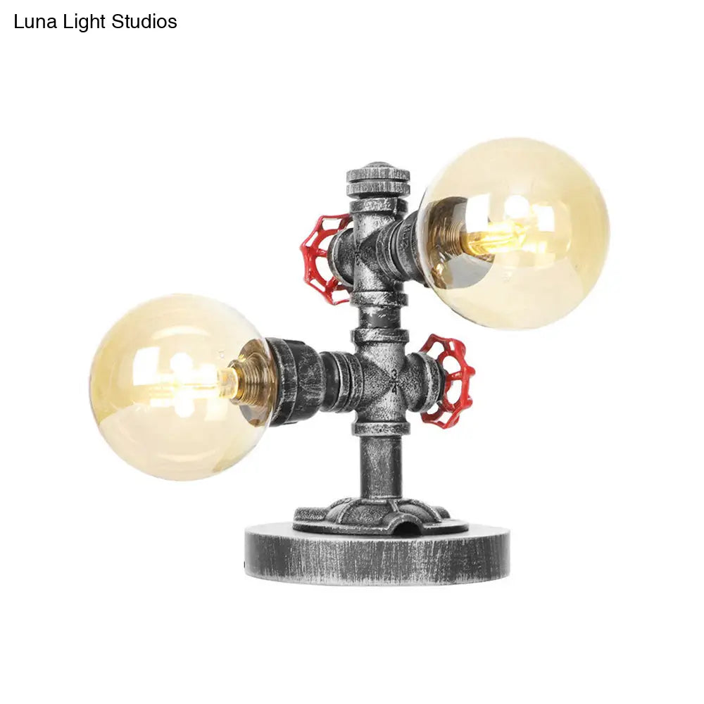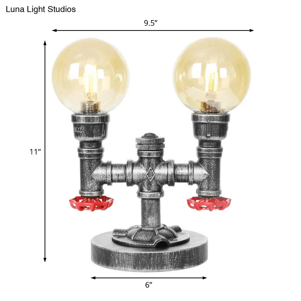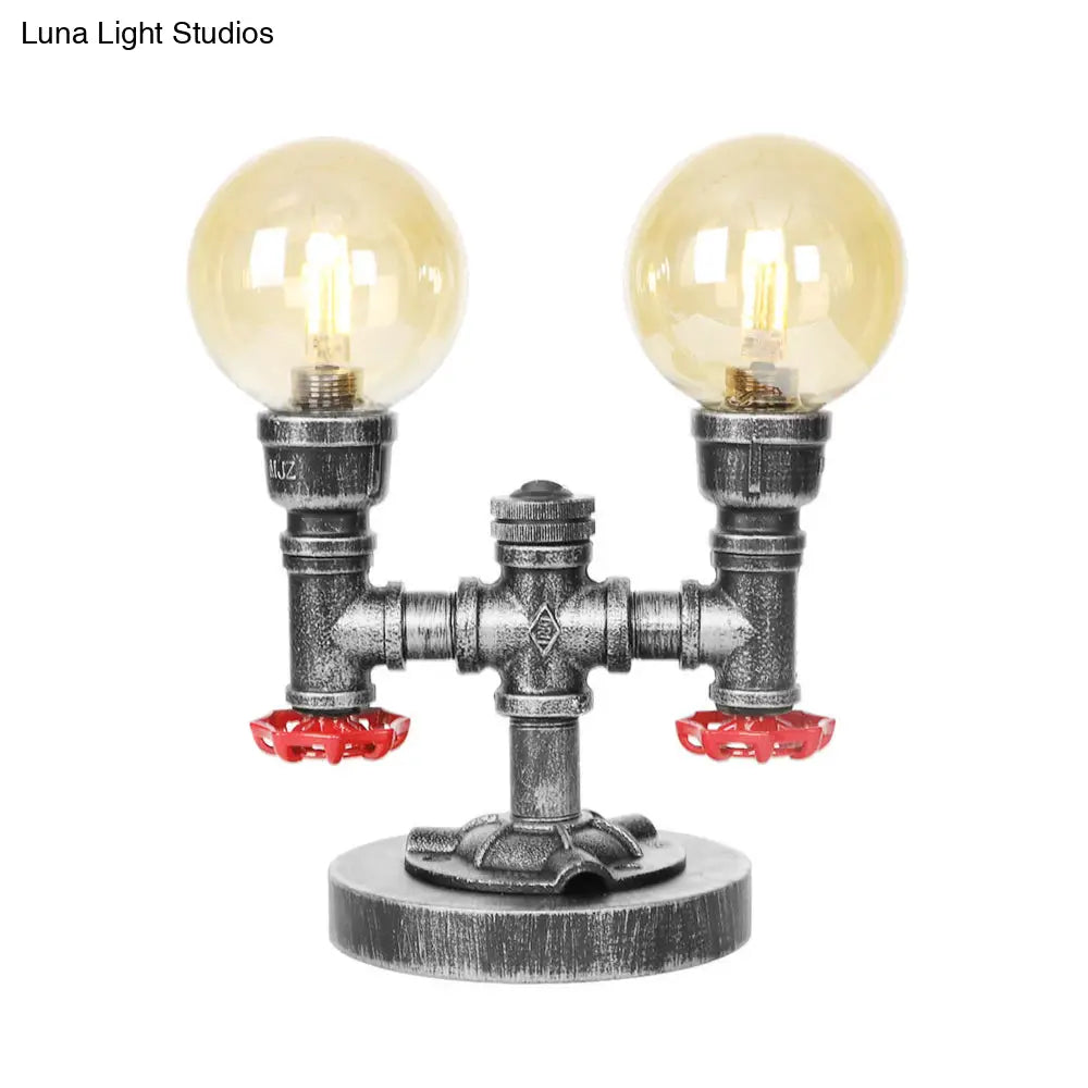 Lámpara de mesa redonda de plata antigua con pantalla de cristal transparente/ámbar - Estilo industrial, 2 luces y base robusta