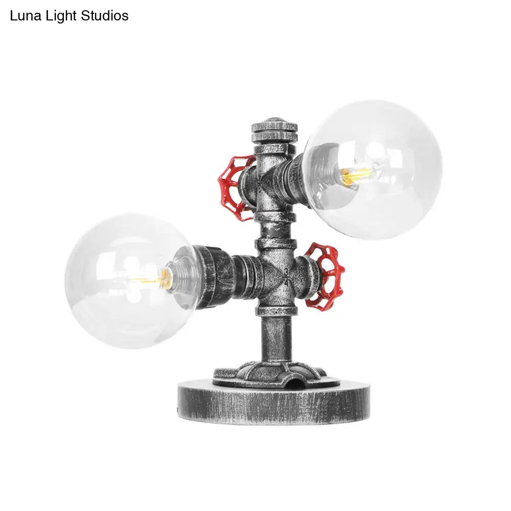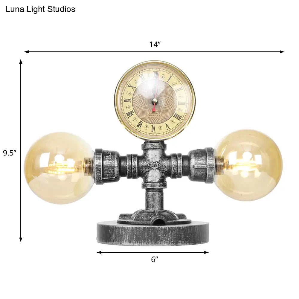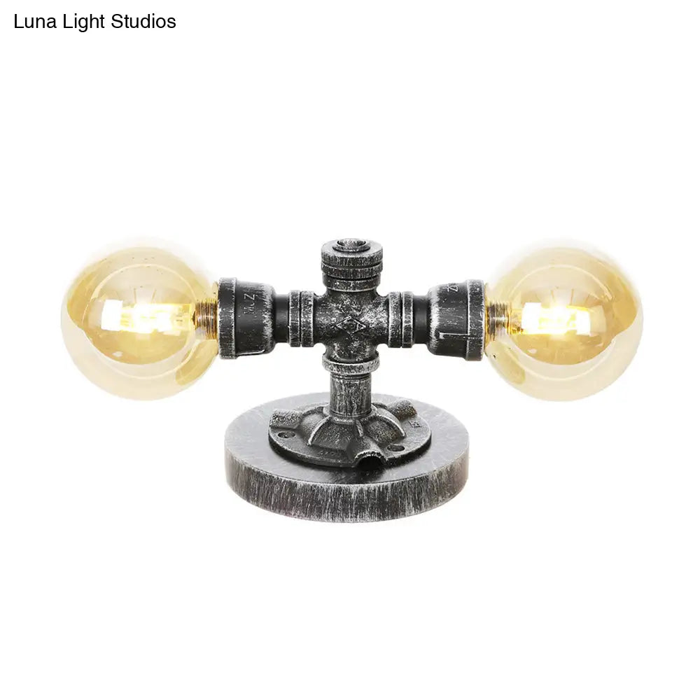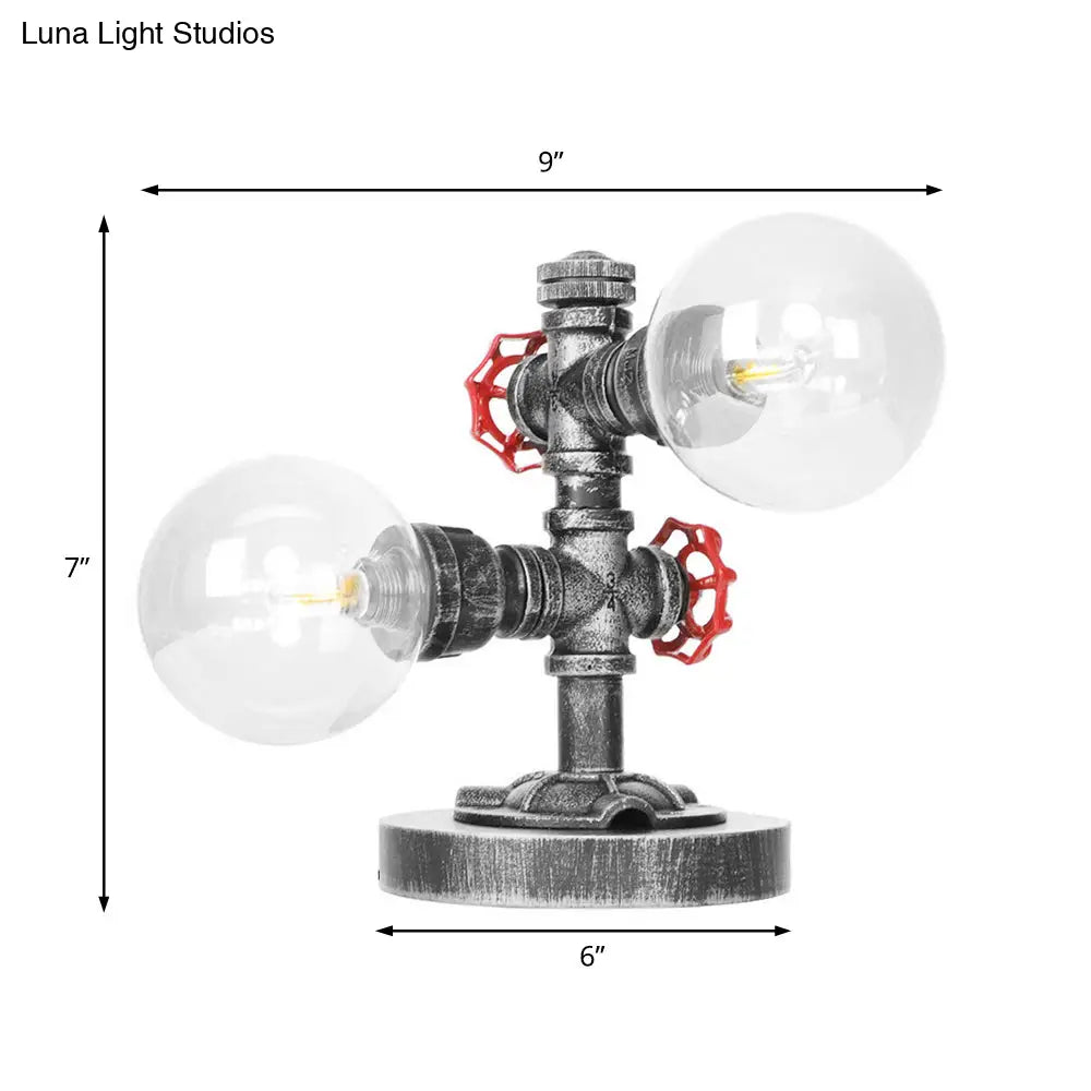 Lámpara de mesa redonda de plata antigua con pantalla de cristal transparente/ámbar - Estilo industrial, 2 luces y base robusta