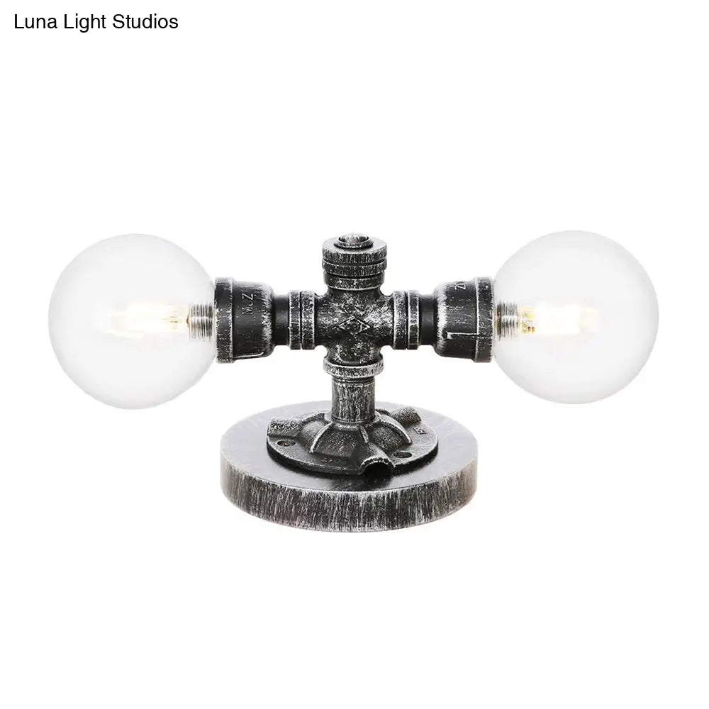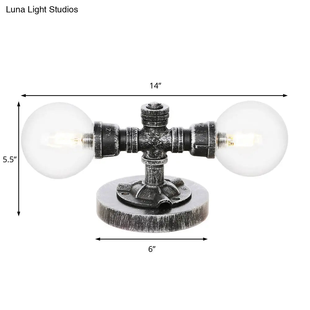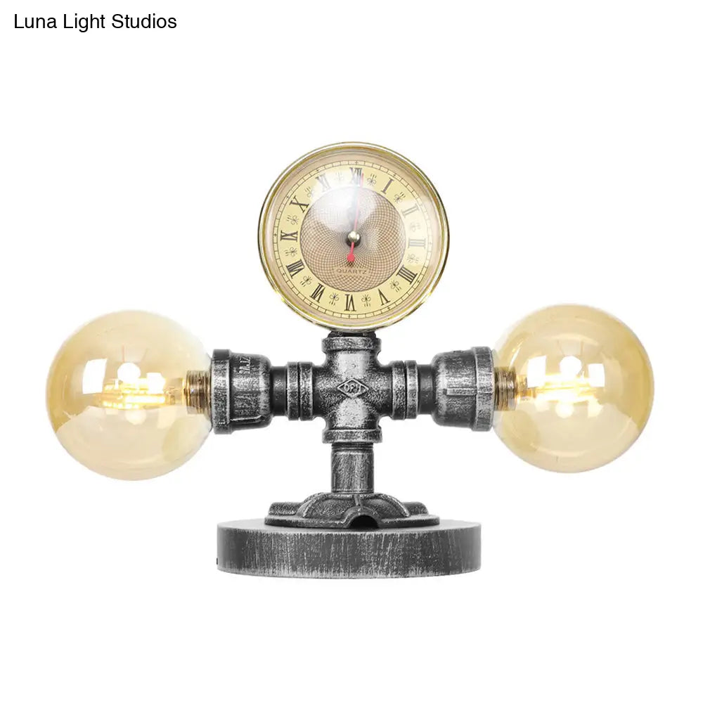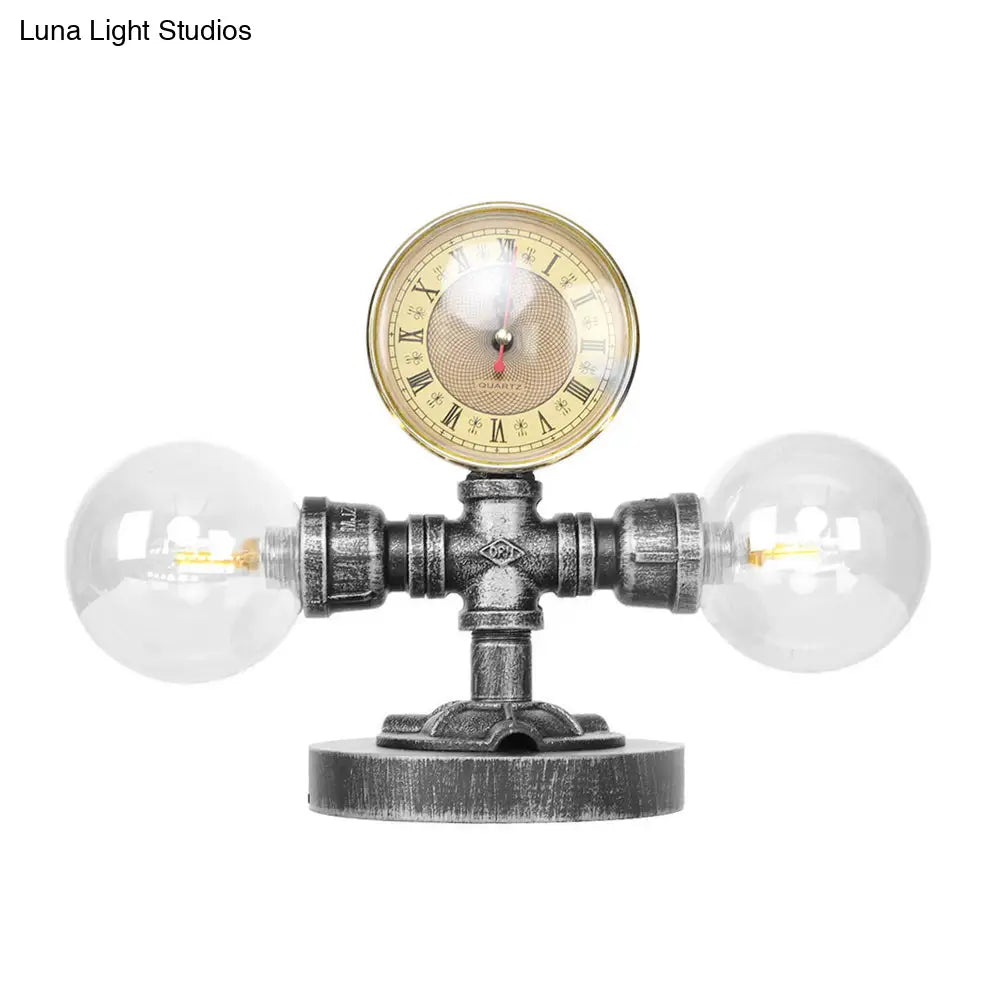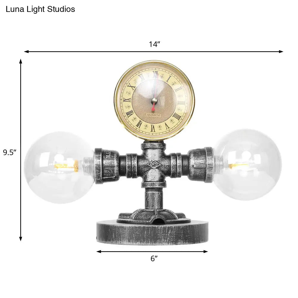 Lámpara de mesa redonda de plata antigua con pantalla de cristal transparente/ámbar - Estilo industrial, 2 luces y base robusta