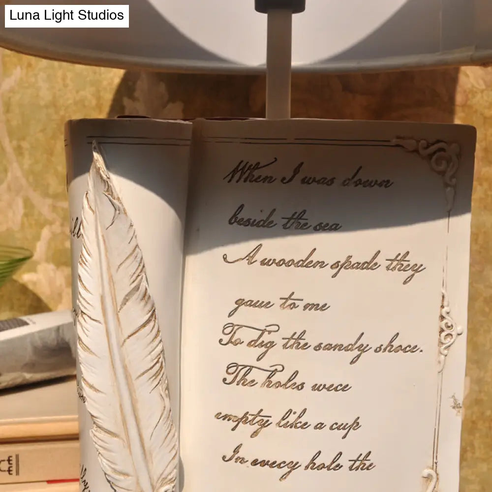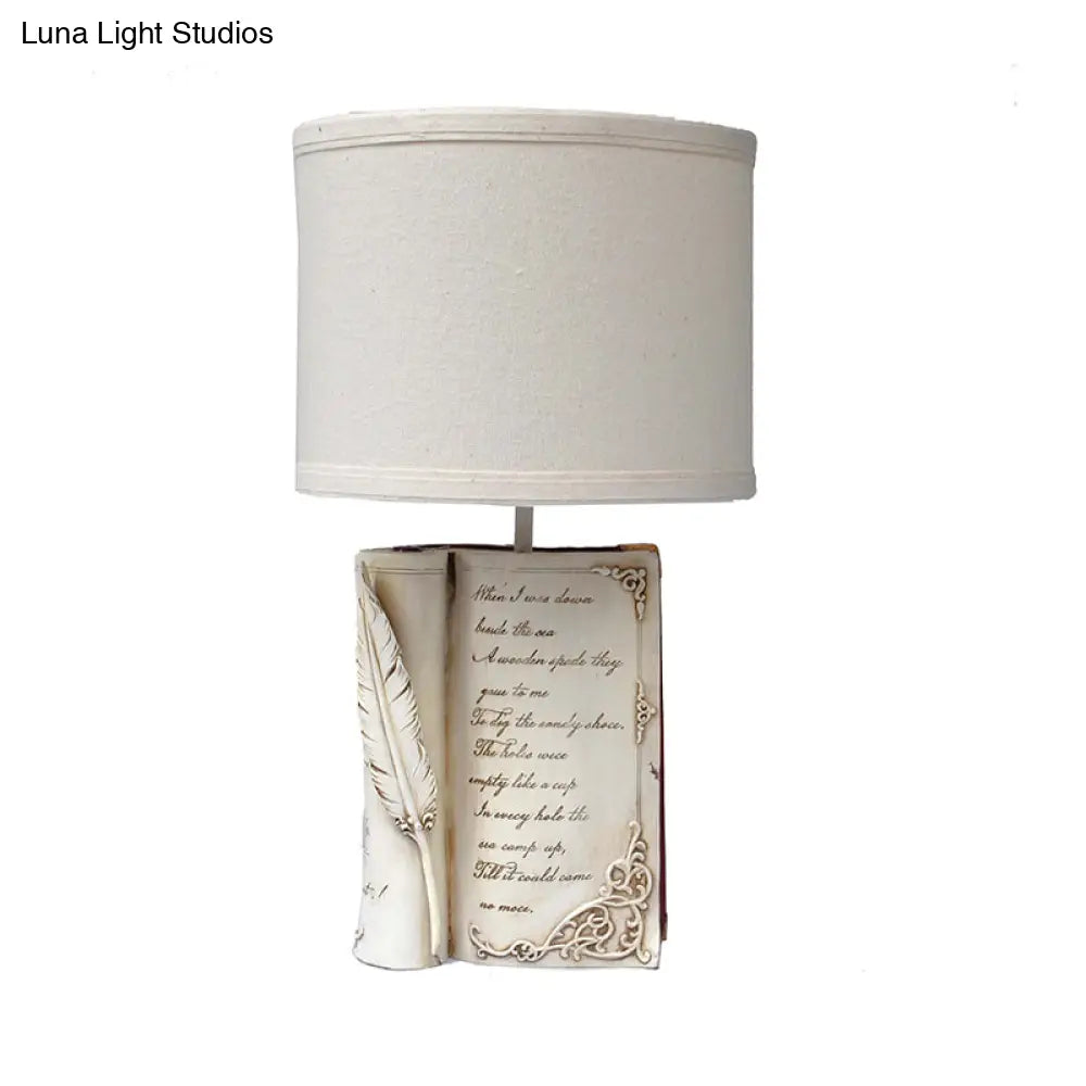 Lámpara de lectura infantil blanca con pantalla cilíndrica y base en forma de libro - Iluminación para estudio o dormitorio