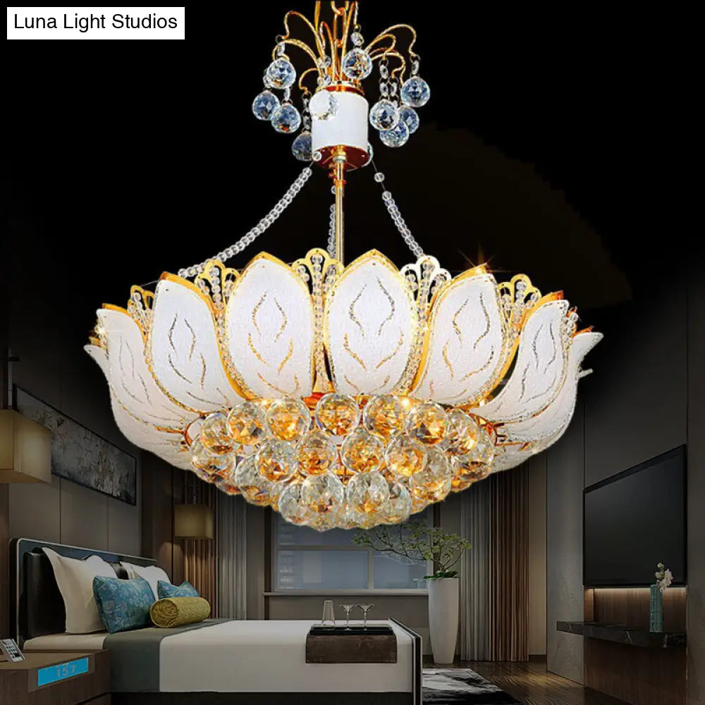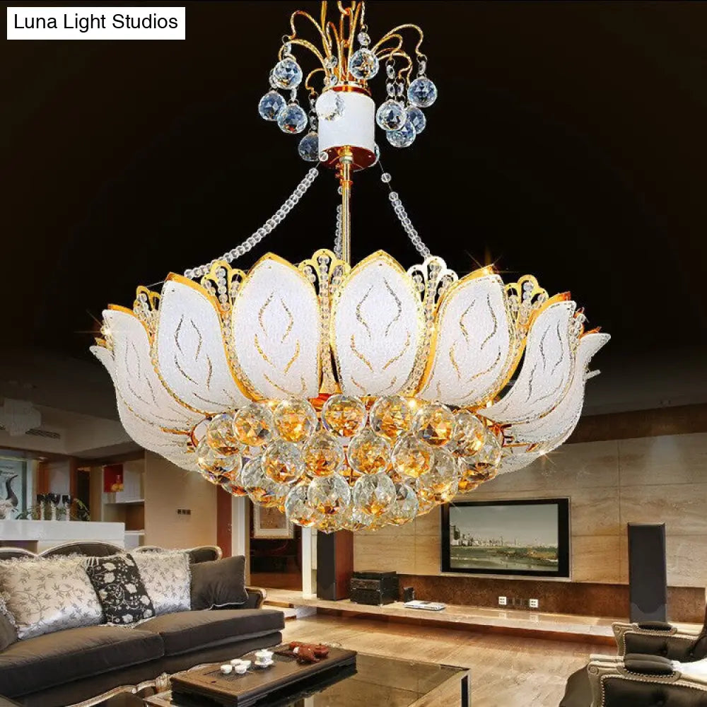 Lámpara de araña contemporánea con forma de loto y bola de cristal facetada – Dorada, 3 luces múltiples – 40,6 cm / 49,5 cm / 59,7 cm de ancho