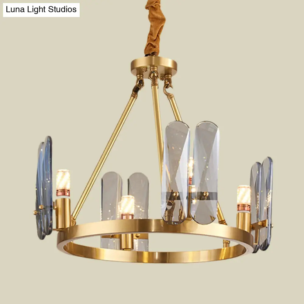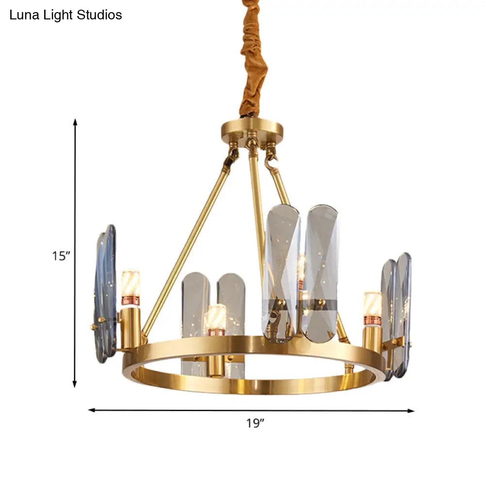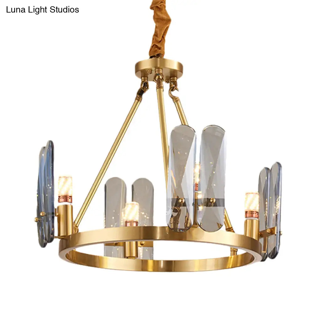 Lámpara de araña circular de latón con 4 cabezales modernistas y panel ovalado de cristal gris humo