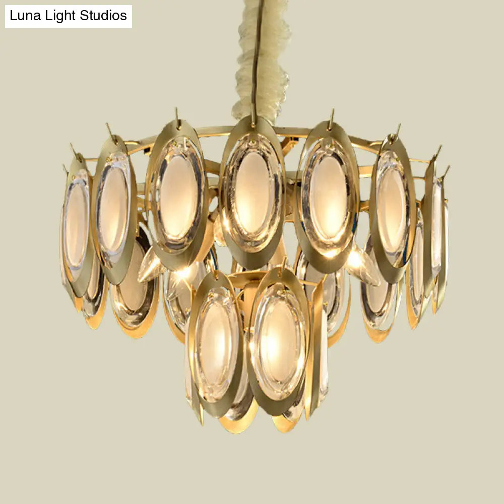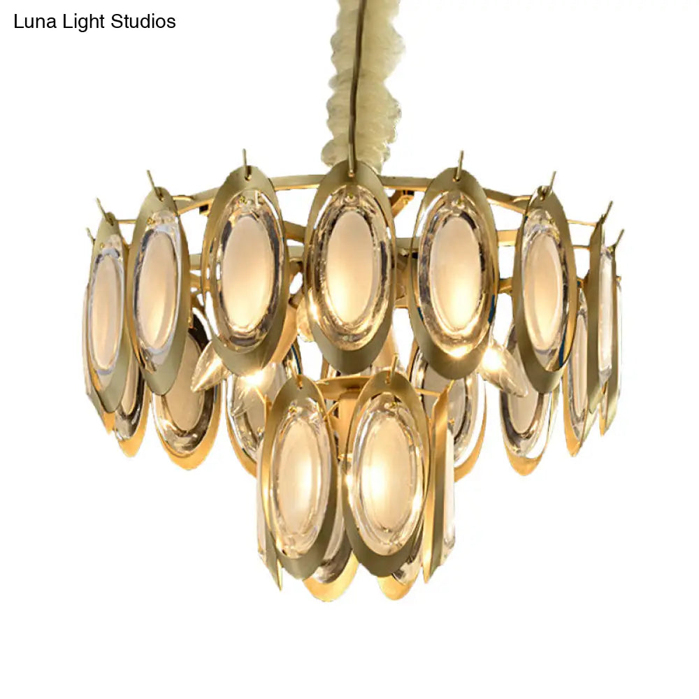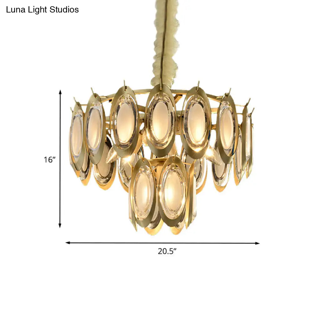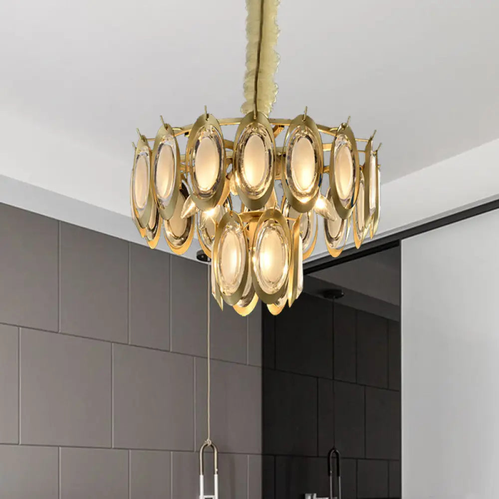 Lámpara de techo moderna de dos niveles, rectangular y metálica, con acabado en latón y siete bombillas colgantes.