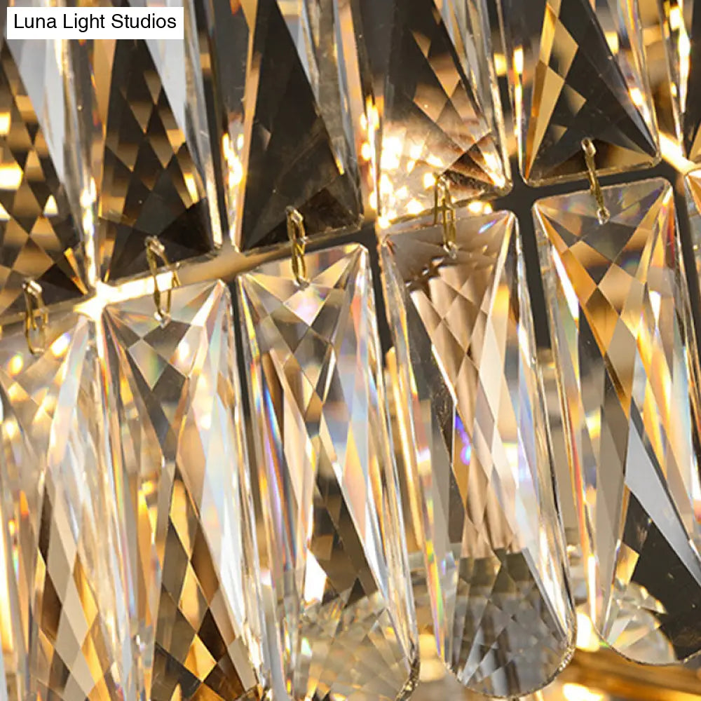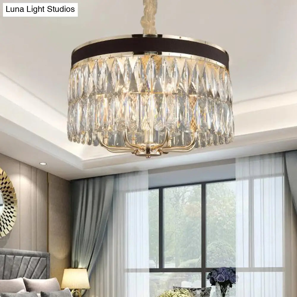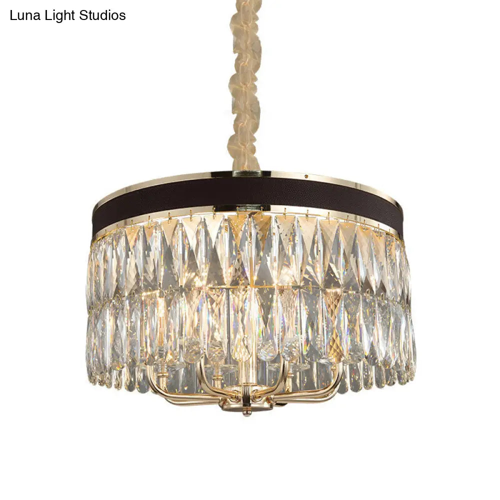 Lámpara de araña moderna tipo tambor con cristal facetado, 8 bombillas, acabado en negro y dorado.