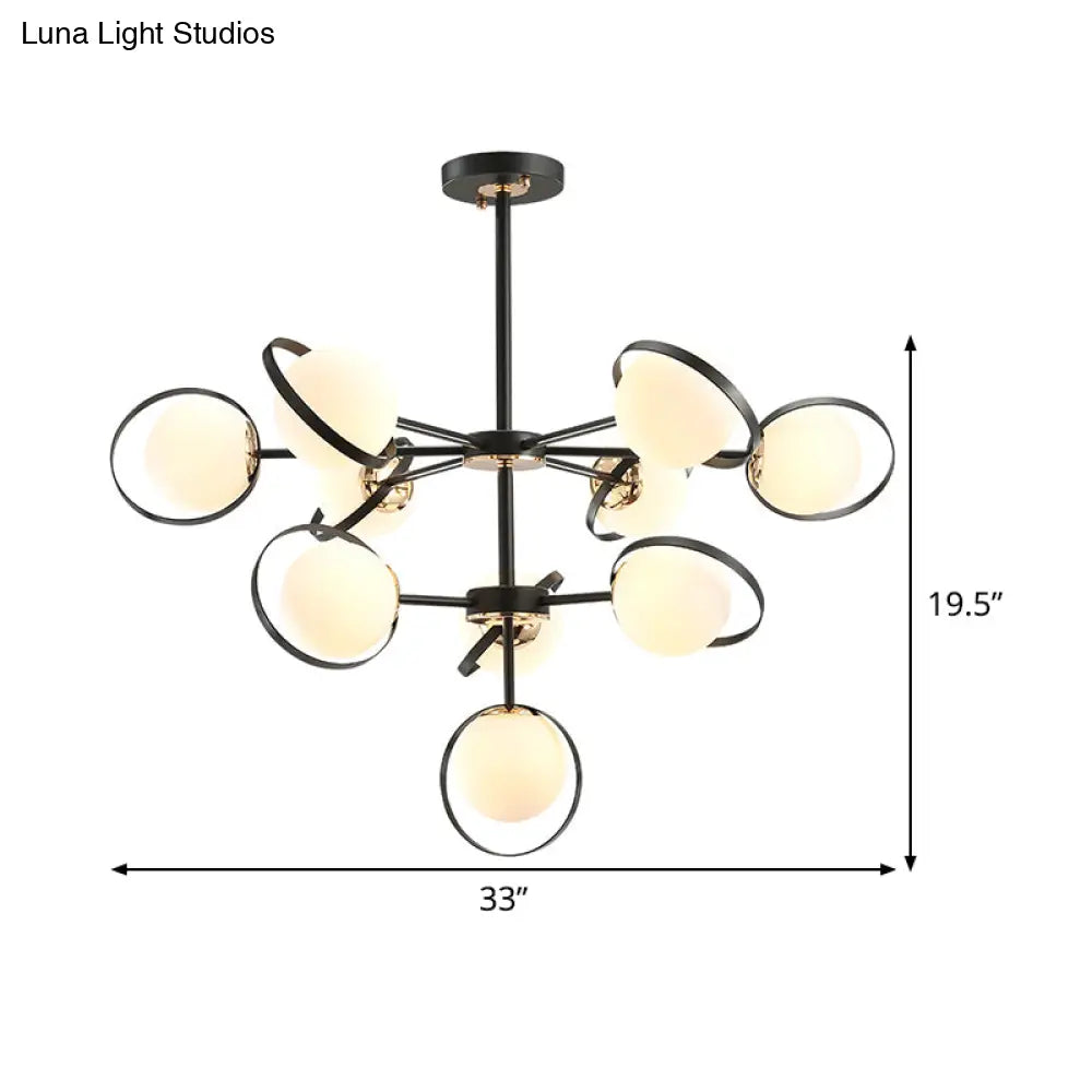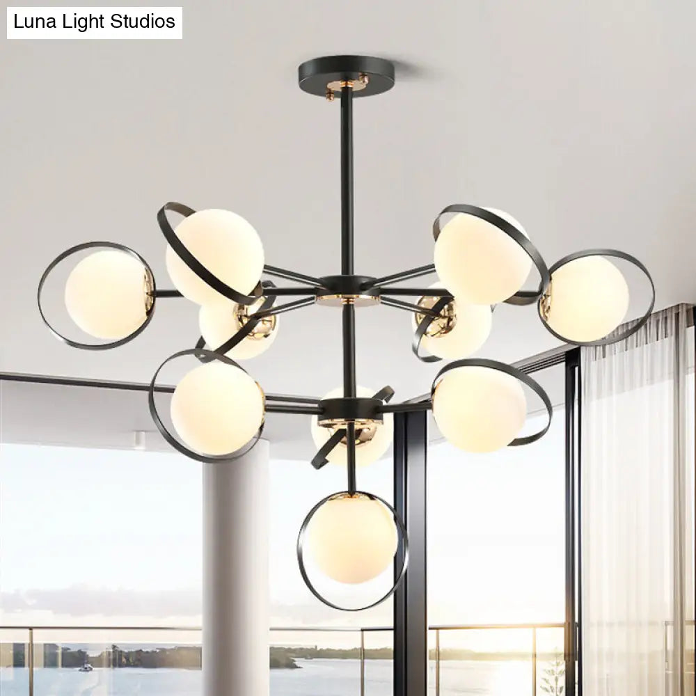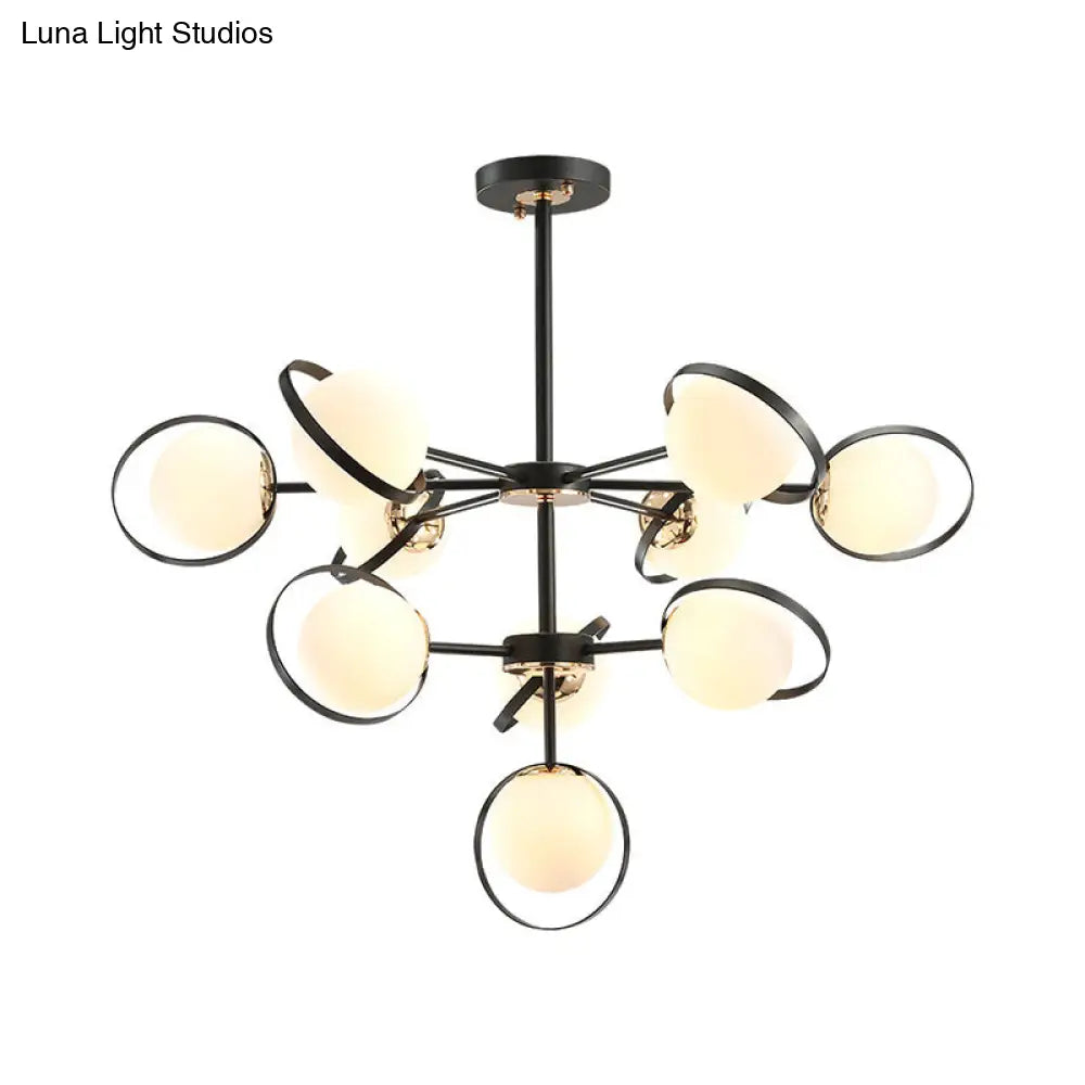 Lámpara de araña colgante Modo de 3 niveles en cristal opalino - Lámpara colgante moderna negra de 10 luces con detalle de anillo