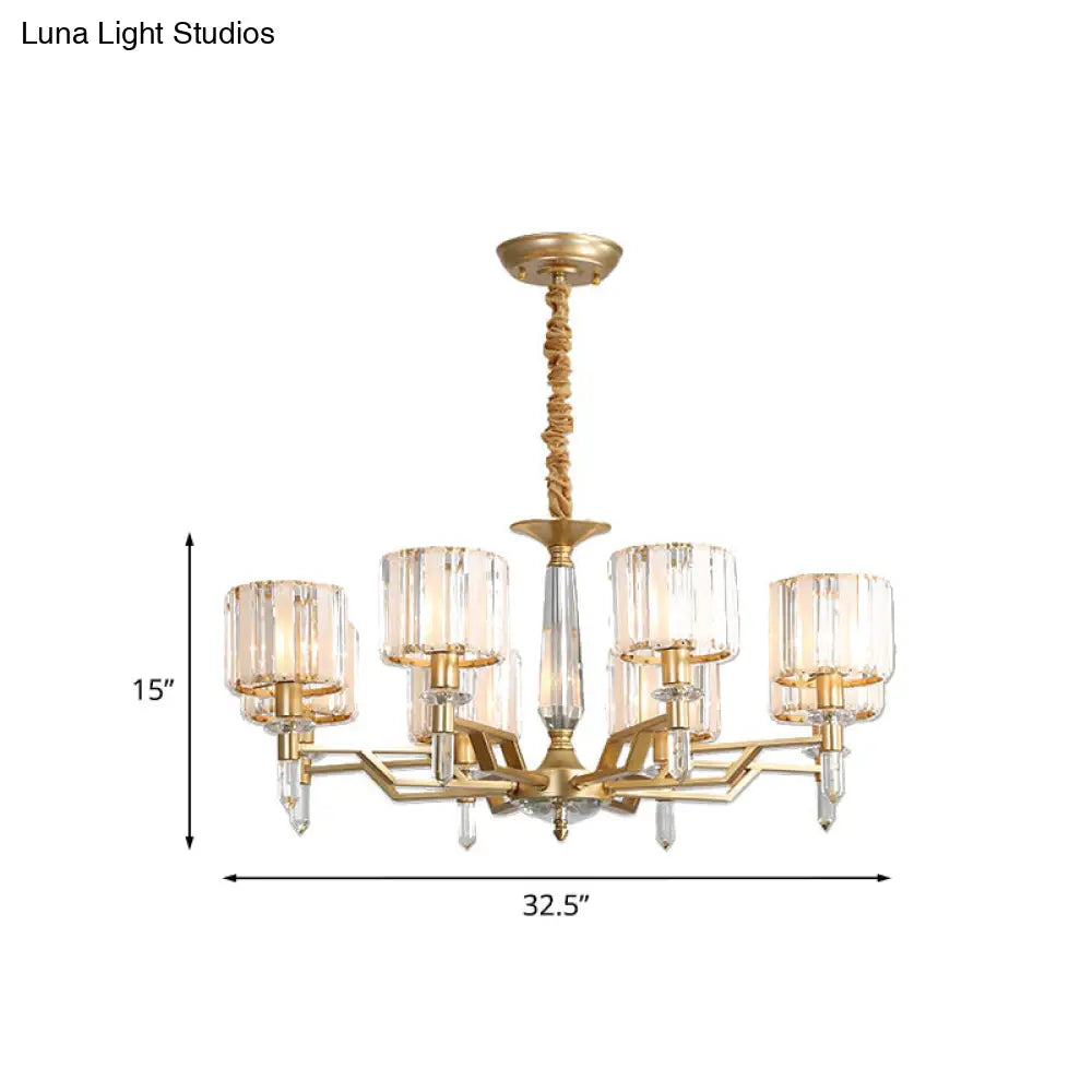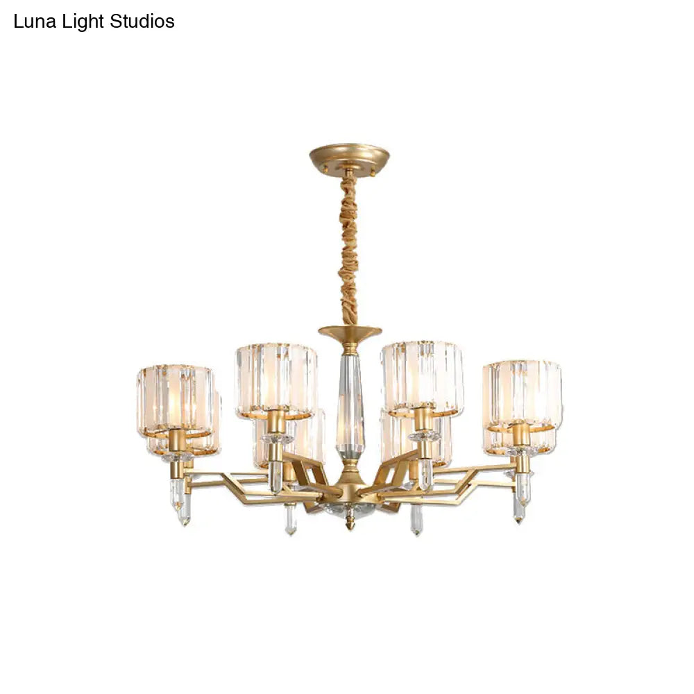 Lámpara de araña de cristal prismático dorado - Diseño cilíndrico posmoderno con 8 cabezales - Lámpara colgante para salón