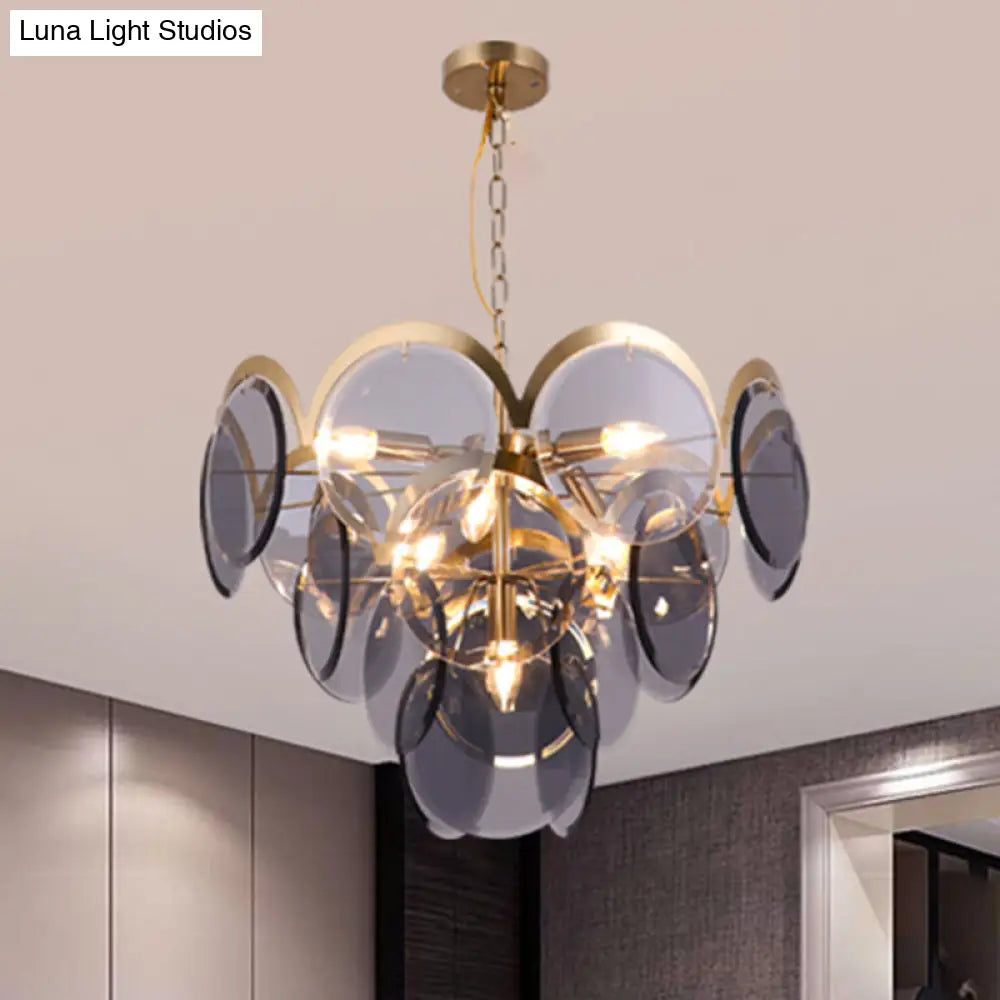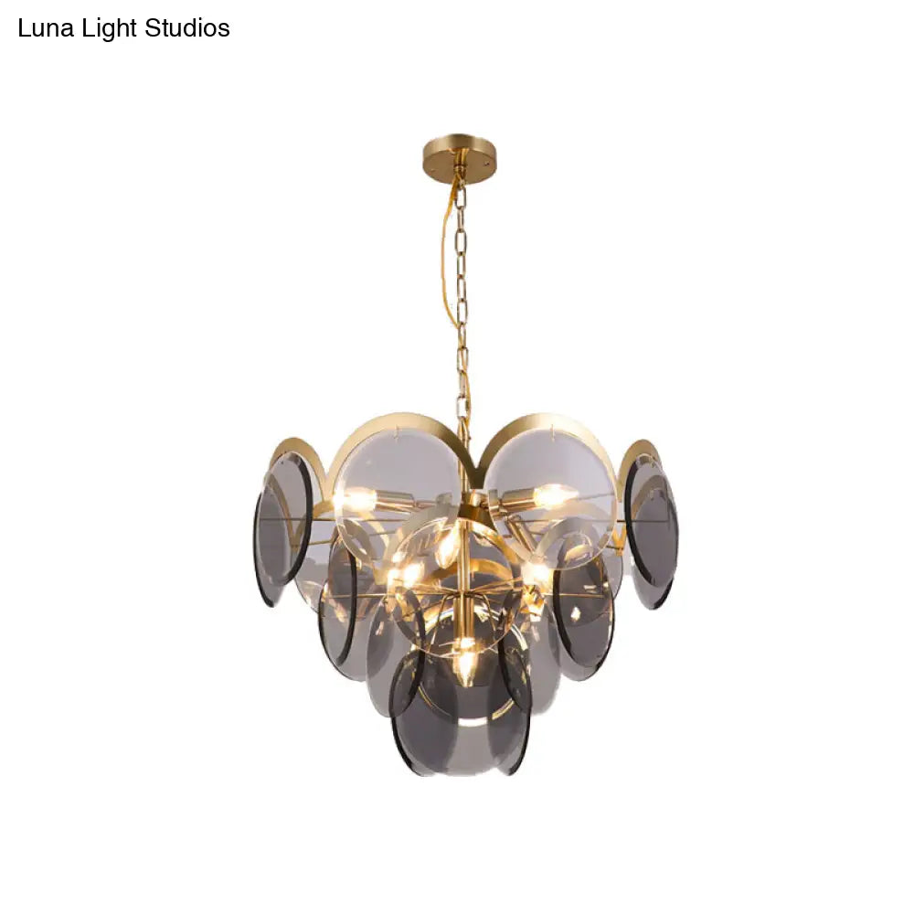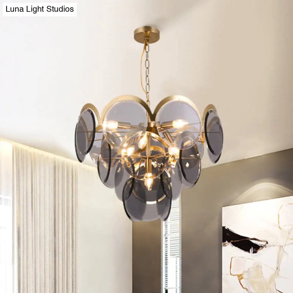 Lámpara colgante redonda de 7 luces con panel de cristal gris humo: moderna lámpara de araña colgante de latón