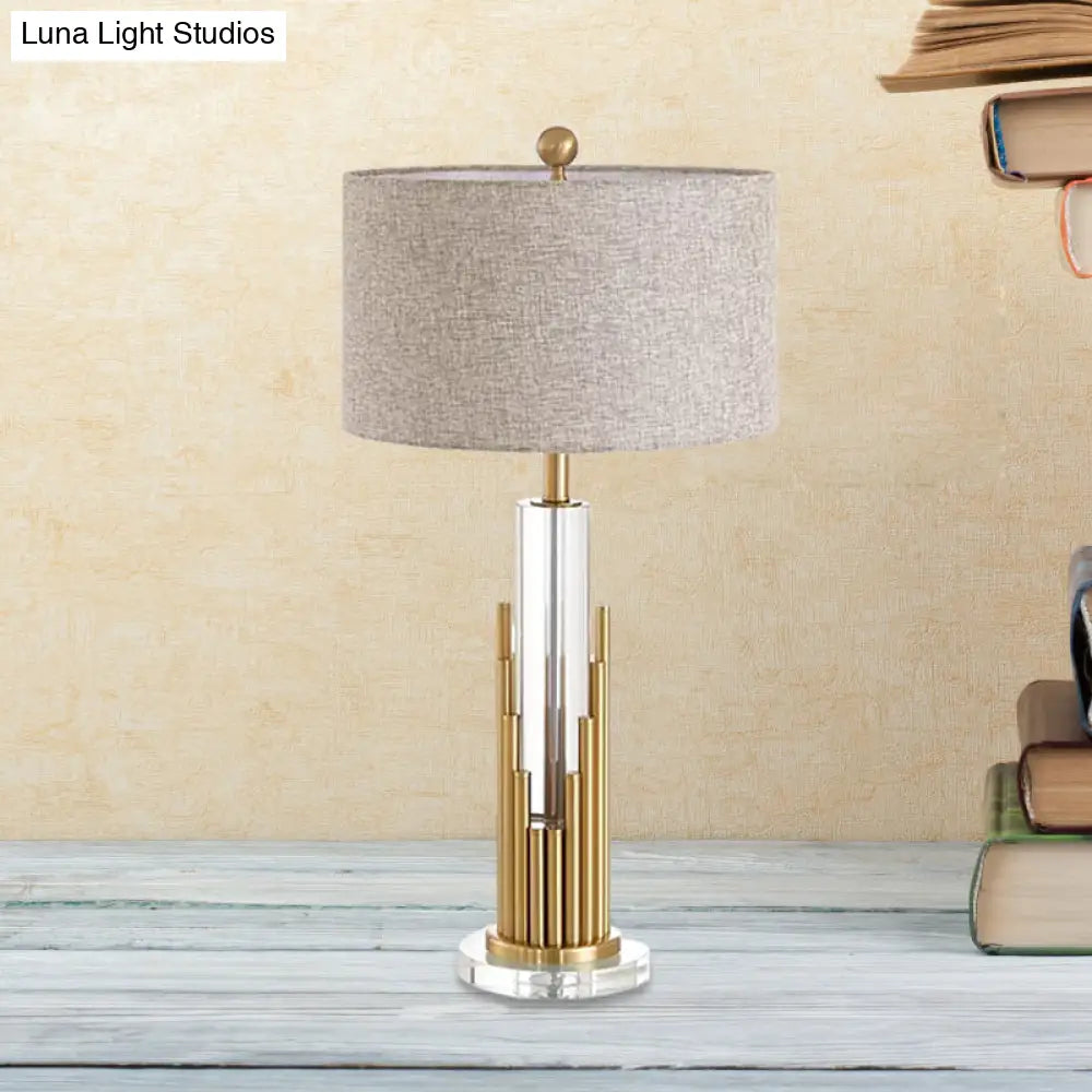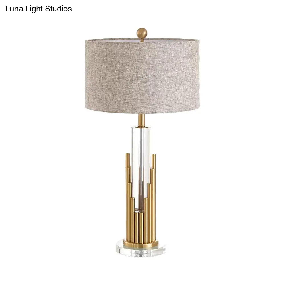 Ankaa - Lámpara de noche de tela con pantalla redonda modernista, lámpara de mesa de lino de 1 cabezal con base acanalada dorada