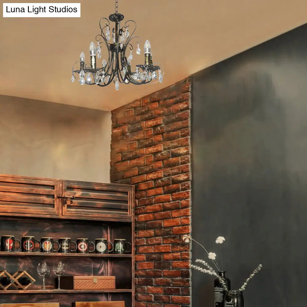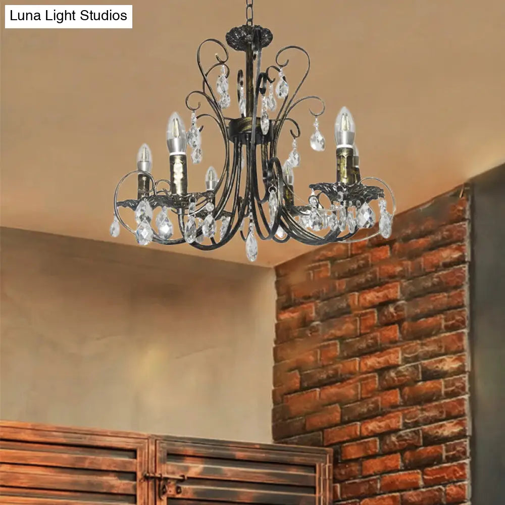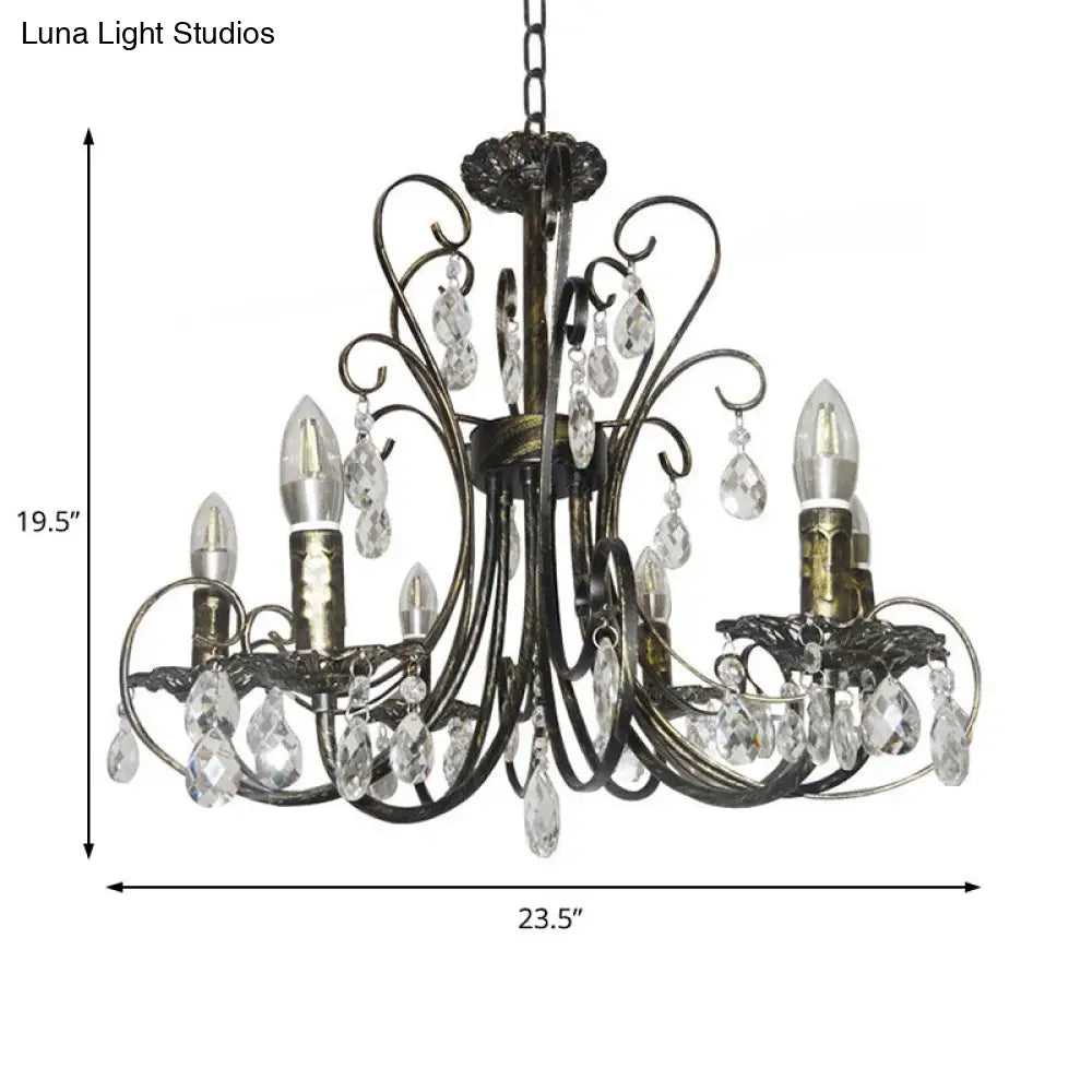 Lámpara de araña rústica: Lámpara colgante de hierro forjado de 6 luces con detalles de cristal - Acabado en latón