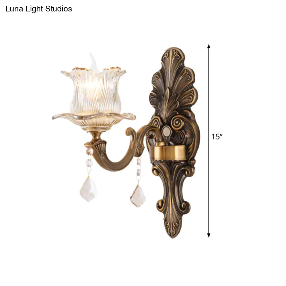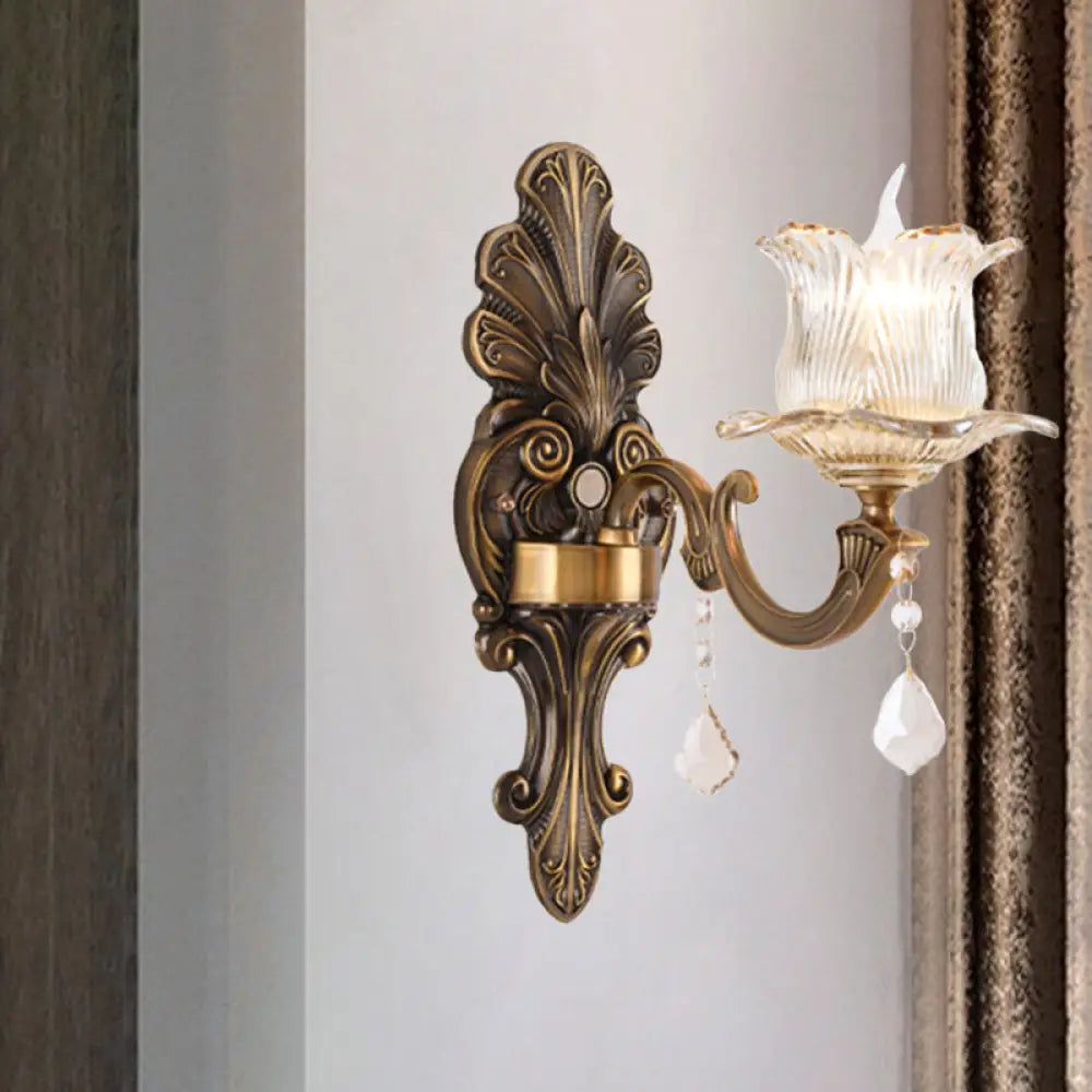 Lámpara de pared antigua de latón: Lámpara de noche individual con pantalla de flores y cristal prismático transparente.