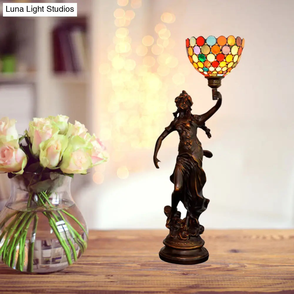 Presentamos la lámpara de mesa Asellus Borealis - Tiffany, una pieza cautivadora que aporta el encanto del estilo Tiffany a su hogar. Esta exquisita lámpara cuenta con una pantalla de cristal multicolor, que evoca las vidrieras, y que proyecta un brillo hipnotizante al encenderse. La base de resina en un elegante color café añade un toque de calidez y sofisticación. Gracias a su compatibilidad con bombillas LED, incandescentes o fluorescentes, podrá crear el ambiente perfecto para realzar cualquier habitación. Eleve su decoración con la lámpara de mesa Asellus Borealis - Tiffany y disfrute de la belleza atemporal de la iluminación estilo Tiffany.