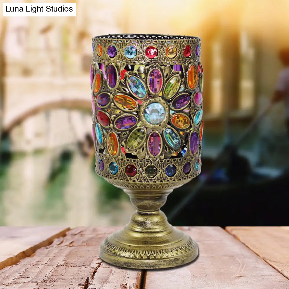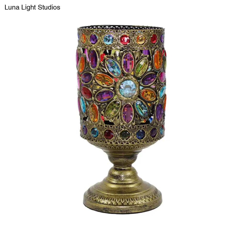 Esta lámpara de noche cilíndrica, de latón, está fabricada en metal y cuenta con una pantalla metálica multicolor. De estilo Art Déco, mide 33 cm de largo y 16,5 cm de ancho. La bombilla no está incluida, pero utiliza un casquillo E12 o E14 y puede ser LED, incandescente o fluorescente. Esta lámpara es solo para uso en interiores.