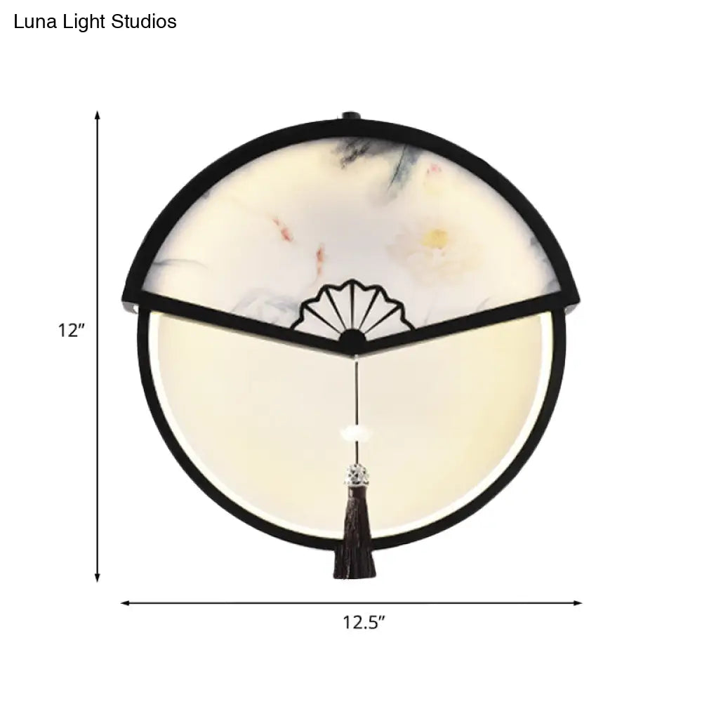 Lámpara de pared LED china de metal negro en forma de abanico con mural de escena de montaña y detalle de borla.