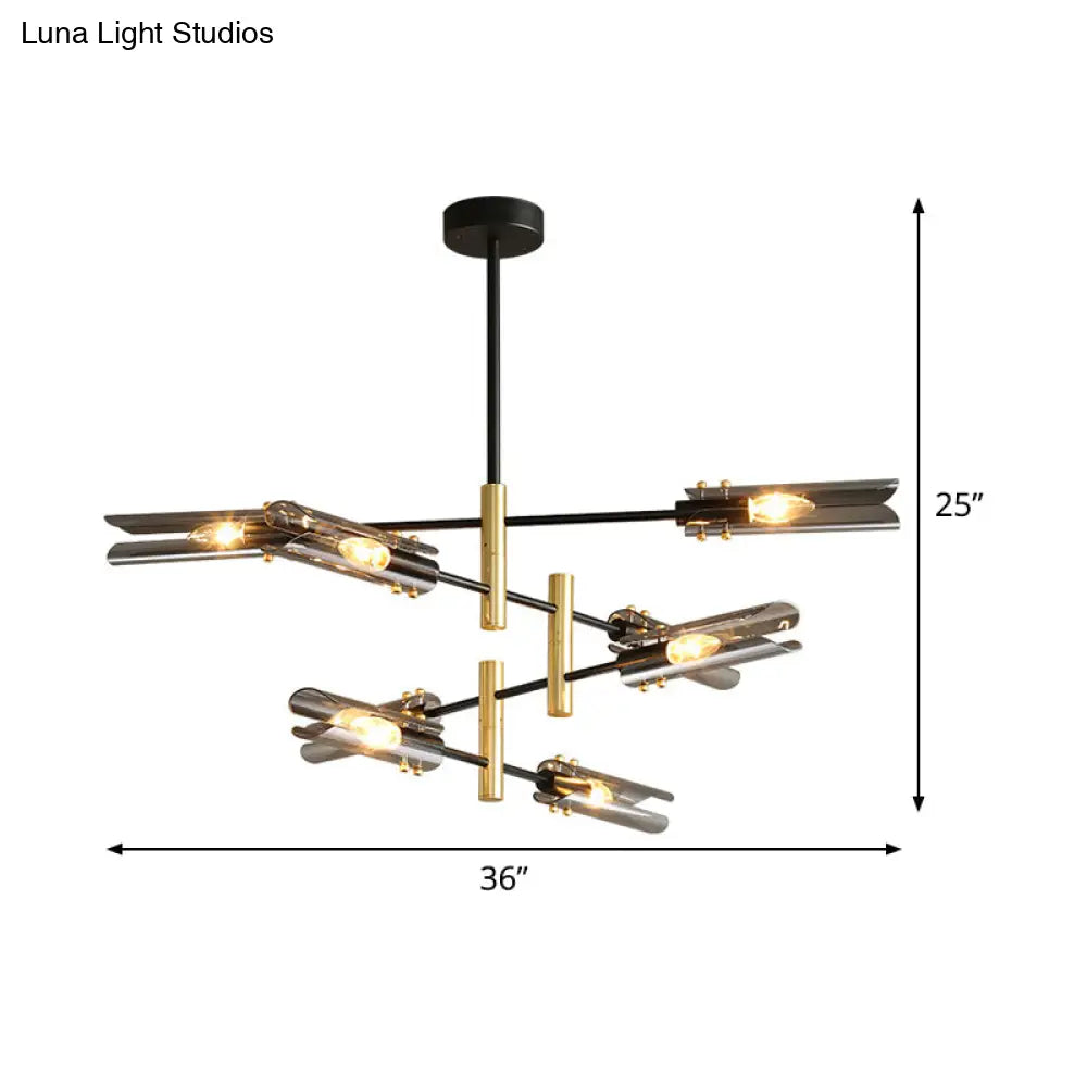 Lámpara de techo tubular moderna de cristal gris humo con 8 luces y acabado en negro y latón.