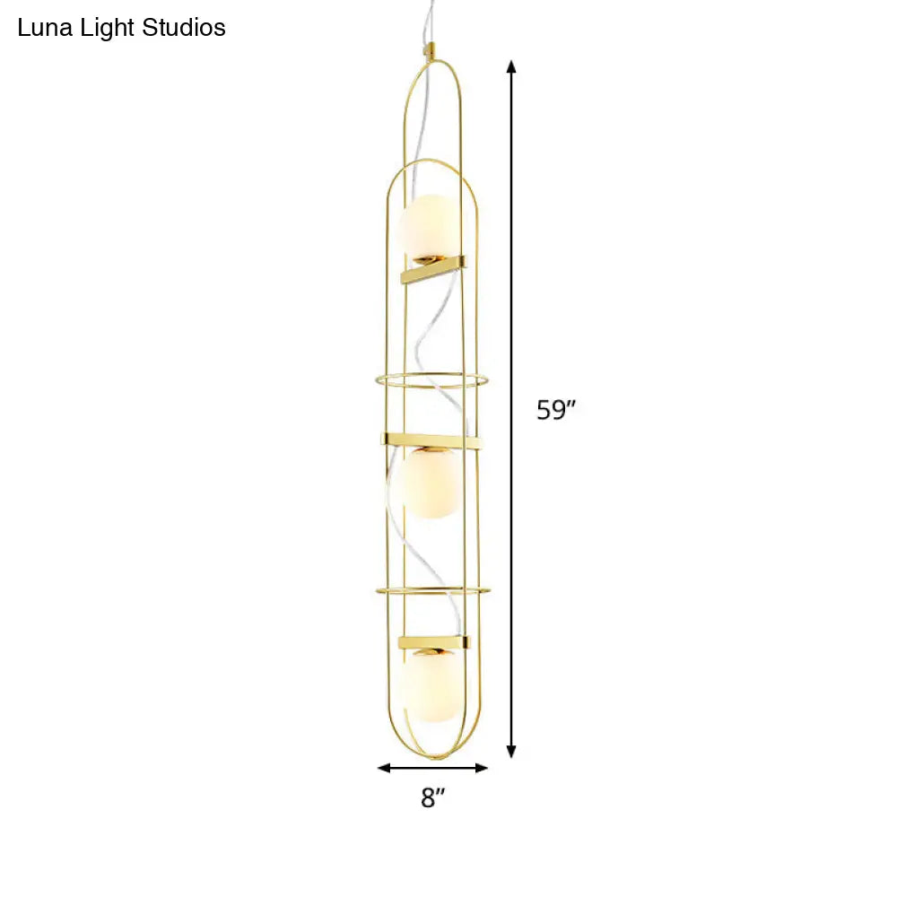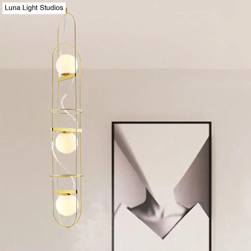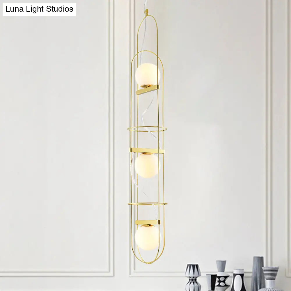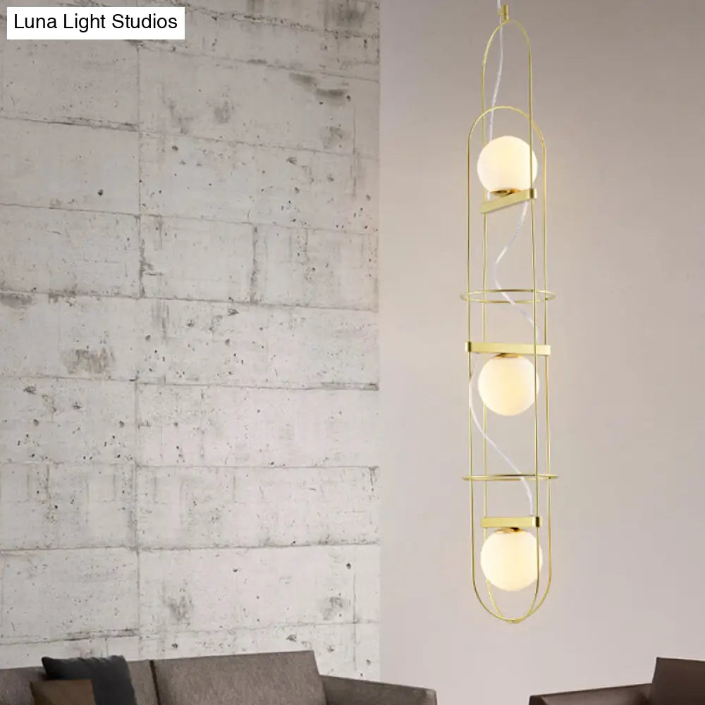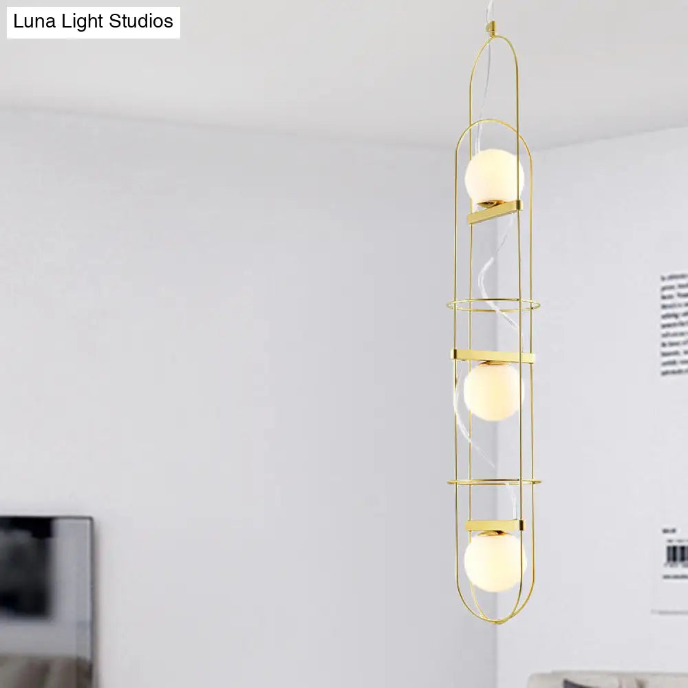 Lámpara de araña moderna dorada con estructura metálica ovalada - Lámpara de techo esférica de cristal blanco (3 cabezales)